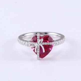 This captivating Pave Ring is meticulously crafted from white gold, showcasing a modern and elegant design. The centerpiece is a heart cut lab gemstone in a vivid pigeon blood ruby color, exuding passion and romance. Adorned with sparkling moissanite stones that form a delicate bow like setting around the heart stone, and additional moissanite embellishments along the band, this ring combines luxury and charm. It’s an ideal choice for those who desire a unique and stylish piece of jewelry.