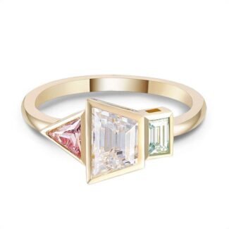Stunning Yellow Gold Blue And pink&colorless Multi Gemstone Three Stone Ring