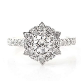 Enchanting White Gold Moissanite Round Cut Floral inspired Engagement Ring