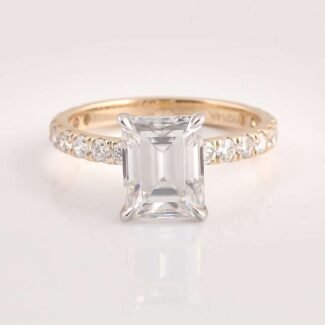 emerald cut moissanite solitaire ring with eternity pave band