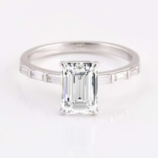 Emerald moissanite ring with baguette diamond band