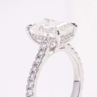 Emerald cut moissanite engagement ring wiht hidden halo