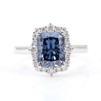 Rounded corners surround:3CT Blue Radiant Cut Moissanite Engagement Ring