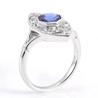 The Royal Hexagon Ring features a custom hexagonal-cut royal blue lab sapphire set in a sculpted precious metal band with intricate filigree engraving. The sapphire’s deep cobalt hue is accentuated by a micro-pavé diamond halo and step-cut side stones, creating a cascade of brilliance against the metal’s cool tone.This piece merges artisanal metalwork with ethical gemstone innovation — where custom cutting meets royal blue grandeur in a statement of modern luxury.