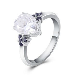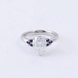Discover the sheer beauty of this Spectacular White Gold Moissanite Ring. The centerpiece is a VVS clarity pear cut moissanite, radiating a dazzling brilliance that catches the eye. Flanking the central stone are smaller moissanite stones in a deep blue hue, adding a striking contrast and a touch of uniqueness. All set in a sleek white gold band, this ring exudes a sense of luxury and elegance. Whether for a special occasion or as a statement piece in your jewelry collection, it’s sure to make a lasting impression.