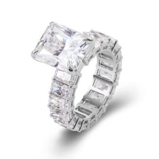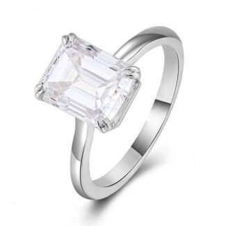 This White Gold Engagement Ring features a VVS clarity moissanite stone with an elegant emerald cut, set in lustrous white gold. The emerald cut’s long, step like facets showcase the stone’s clarity and brilliance, giving it a sophisticated and timeless appeal. The sleek white gold band complements the center stone perfectly, creating a harmonious and luxurious look. Ideal for those who desire a classic yet contemporary piece to mark a special commitment.