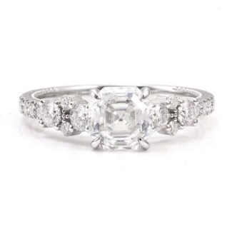 Behold this Stunning White Gold Moissanite Ring, a true masterpiece of jewelry craftsmanship. The centerpiece is a moissanite of VVS clarity, expertly cut in the Asscher style. The Asscher cut, with its distinctive square shape and stepped facets, gives the stone a sophisticated and timeless allure, allowing it to radiate a brilliant sparkle. Surrounding the center stone are smaller moissanite accents, adding to the ring’s overall charm and enhancing its dazzling effect. Set in lustrous white gold, this ring combines luxury and elegance, making it an ideal choice for special occasions or as a cherished addition to your jewelry collection.