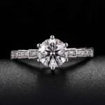 This elegant White Gold Ring is meticulously crafted from 18K white gold. At its core is a large, brilliant round cut lab diamond, which is securely held by prongs, allowing it to radiate its full sparkle. The band features a unique design with small lab diamonds embedded in rectangular settings, adding a touch of sophistication and extra shine. A perfect blend of classic and contemporary styles, this ring is an ideal choice for those seeking a timeless symbol of love. Whether for a proposal or as a cherished keepsake, it combines the allure of lab created diamonds with superior craftsmanship.