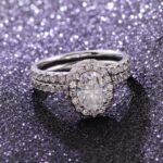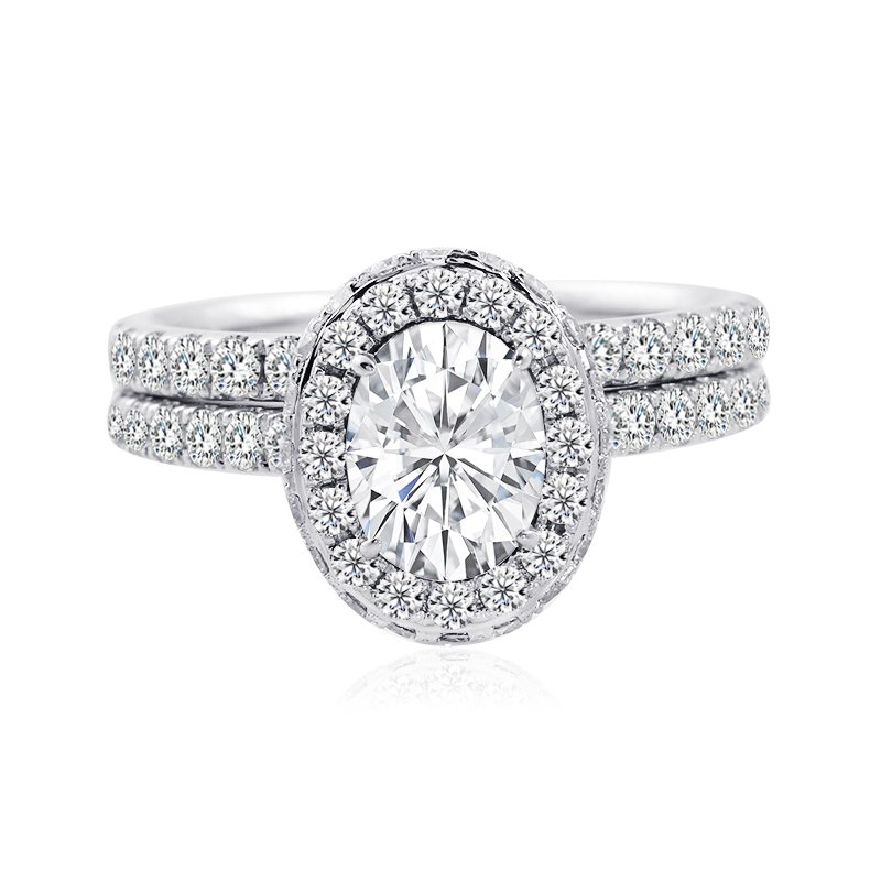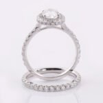 This beautiful Moissanite wedding set features a classic halo design, an oval shape brilliant Moissanite center stone, and total 75pcs of round brilliant Moissanite side stones. The ring is shown with a 1.5ct/8x6mm oval brilliant Moissanite center stone.