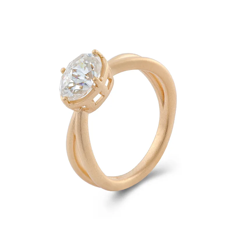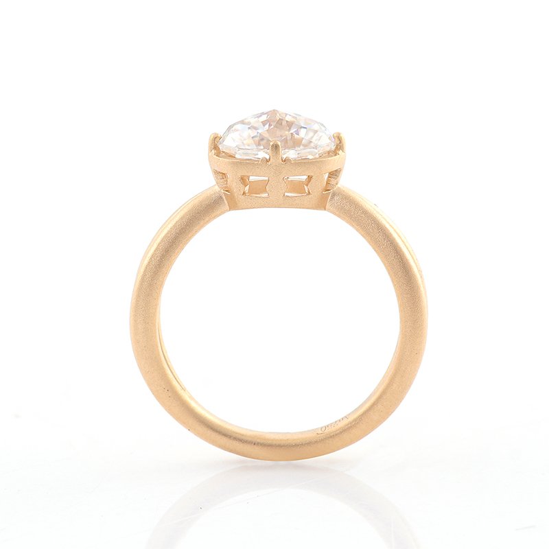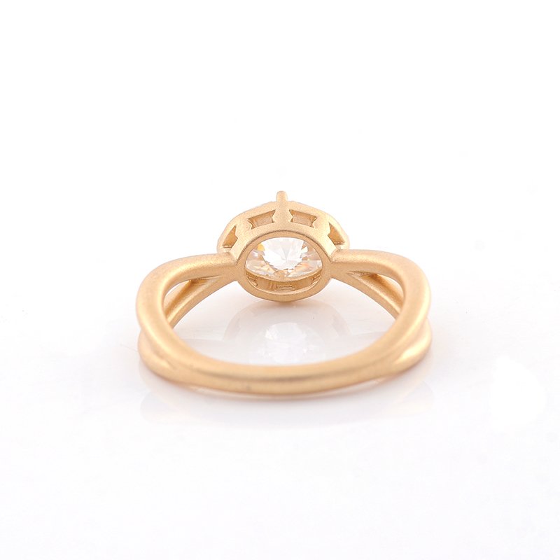 This solitaire ring features elegant open spaces that allow this ring with a whimsical, sophisticated design. The simple design allows the ring to accentuate the beauty and gloss of Moissanite.