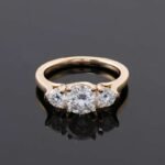 Let your love story sparkle endlessly with this captivating 1.5CTW three stone round cut engagement ring. A mesmerizing 6.5mm round moissanite takes center stage, its VVS clarity and colorless brilliance capturing every ray of light. Flanked by two sparkling 4mm round moissanites, the trio symbolizes your past, present, and eternal future together.