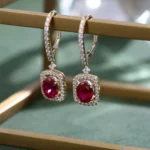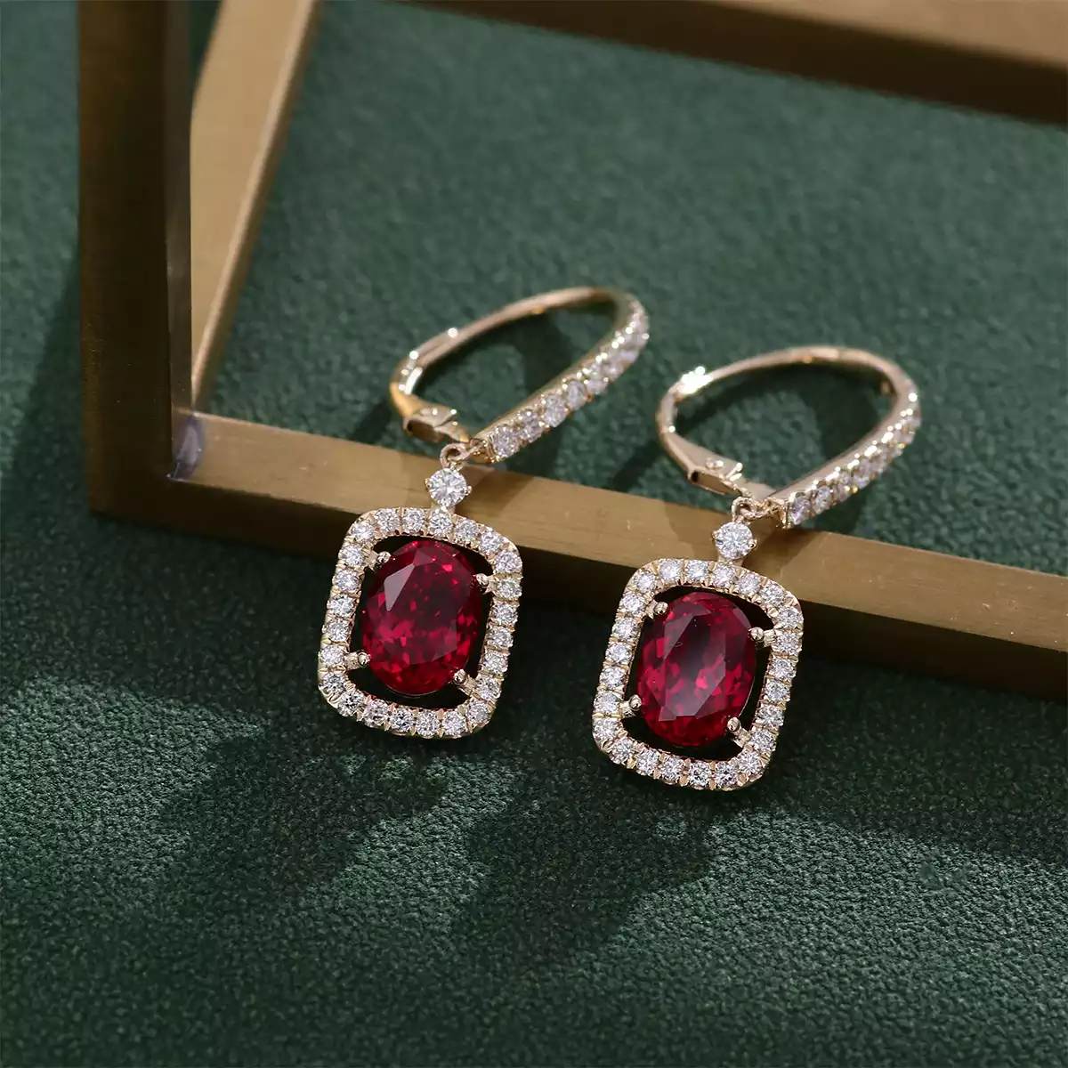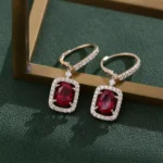 Ruby & Moissanite Drop Earrings: Elevate your look with these 10K yellow gold drop earrings featuring 2ct oval-cut rubies encircled by a halo of sparkling moissanites. Perfect for special occasions or daily wear, these earrings add a touch of elegance to any outfit.