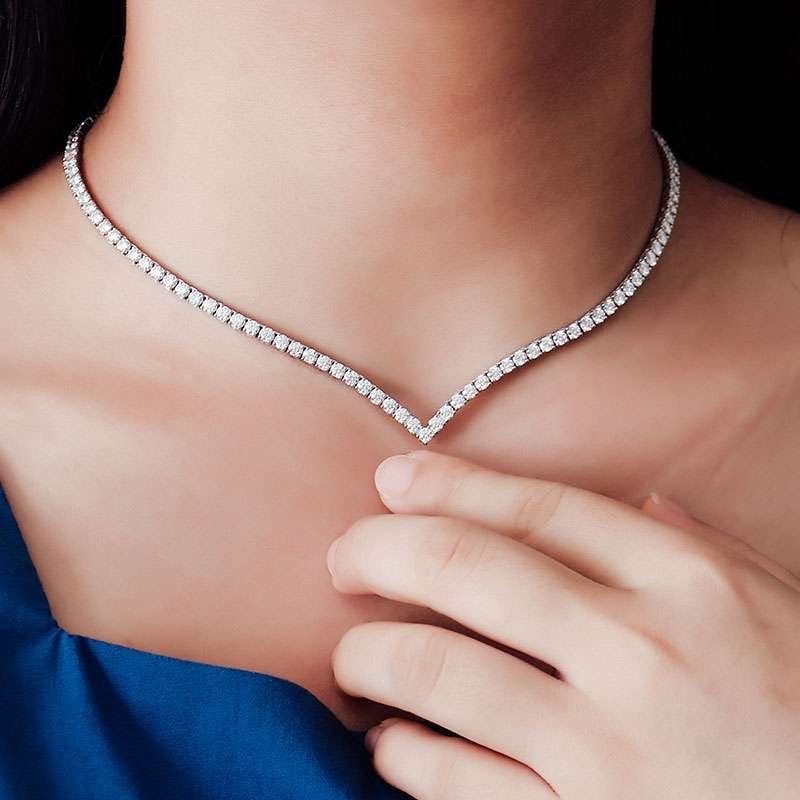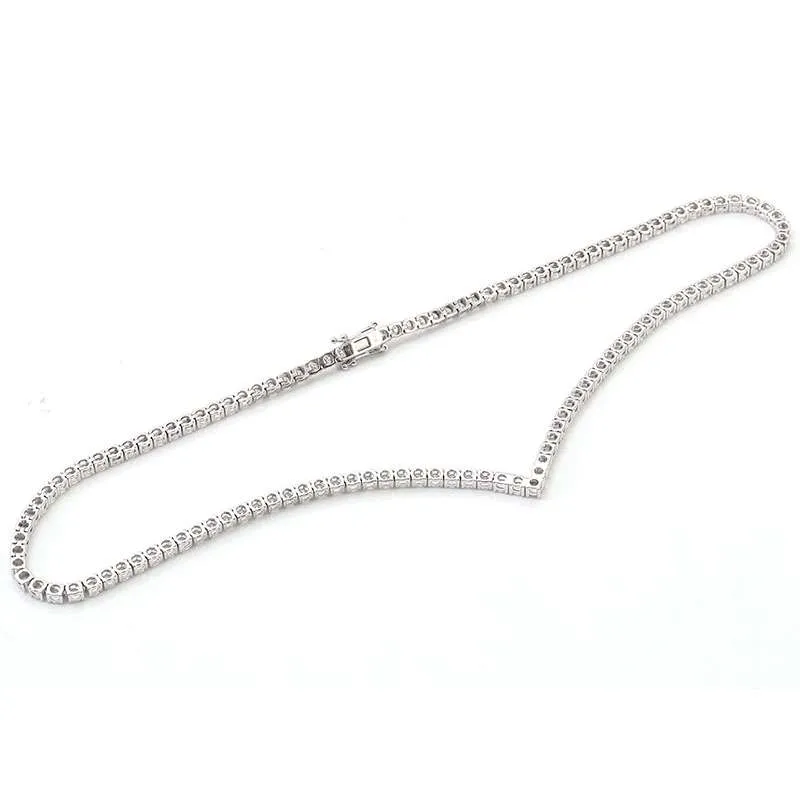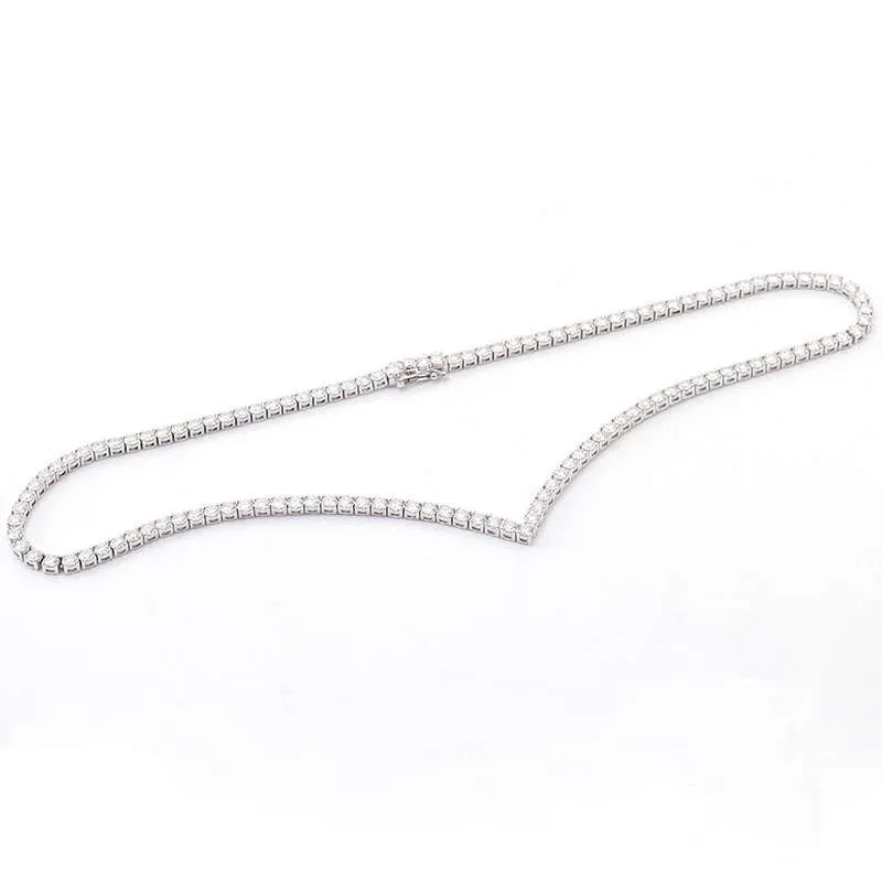 12.6ct round cut moissanite v-shape necklace, a stunning piece that combines modern design with classic elegance. Crafted from high-quality moissanite, this necklace features a striking V-shaped arrangement that perfectly frames the neckline. Perfect for everyday wear and special occasions, this necklace will add a touch of sophistication to any outfit.