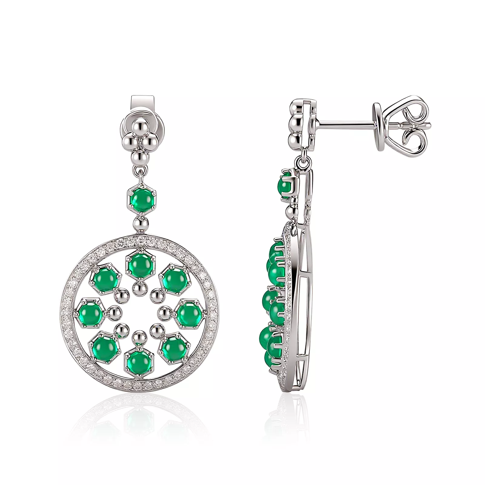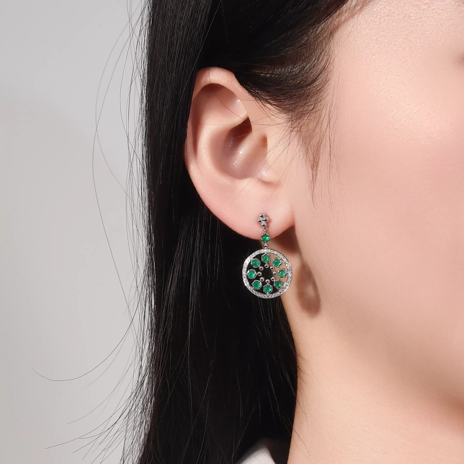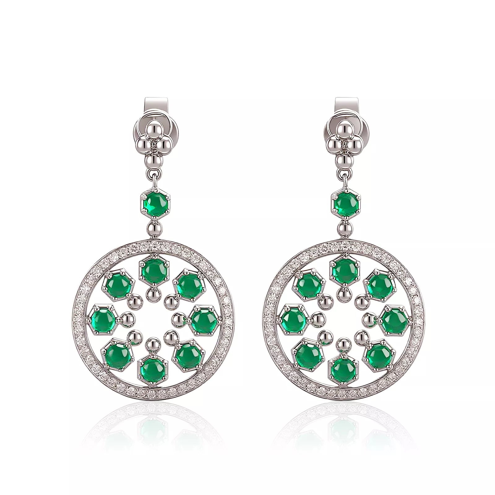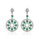 Inspired by the geometric glamour of the Art Deco era, these exquisite emerald and diamond medallion drop earrings are a true work of art. Each earring showcases a stunning openwork medallion, where vibrant green emeralds are set in a delicate, starburst-like pattern around polished gold beads. Crafted in lustrous 18k white gold and designed to sway with graceful movement, these are the perfect statement piece for any elegant affair.