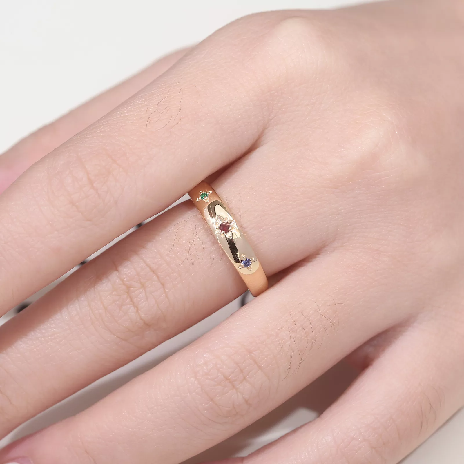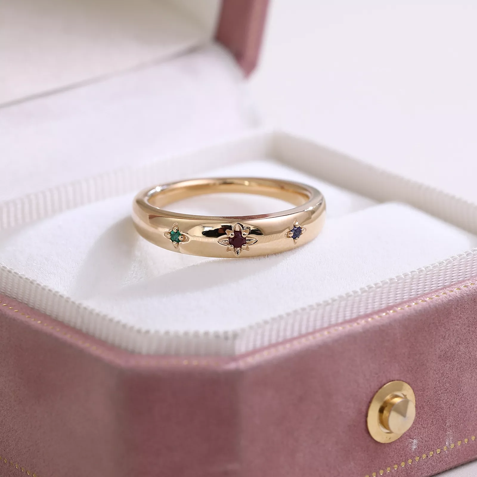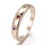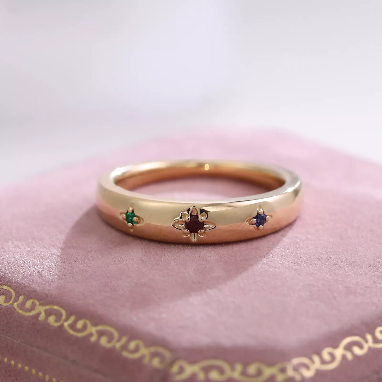 This Lab Gemstone Three Stone Ring centers three ethically created gems in vibrant signature hues, each cradled in openwork petal settings. The sleek rose gold band showcases minimalist elegance, its unadorned surface allowing the saturated lab ruby, emerald, and sapphire to command full attention. Modern symbolism meets heritage craftsmanship in this enduring statement piece.
