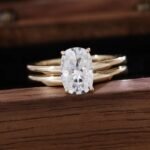 This alluring Yellow Gold Ring Set is a paragon of elegance, featuring a magnificent cushion cut moissanite of VVS clarity, artfully set in luxurious yellow gold. The central moissanite, with its soft, rounded corners and brilliant facets, radiates a captivating sparkle, drawing the eye with its sheer beauty. The smooth, polished band of the accompanying ring complements the centerpiece, creating a harmonious and sophisticated look. The warm, golden hue of the metal enhances the stone’s brilliance, making this set a perfect choice for those who appreciate timeless elegance and luxury. Ideal for special occasions or as a cherished addition to your jewelry collection.