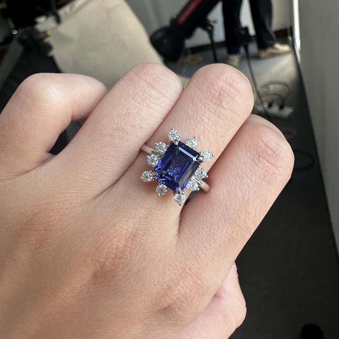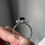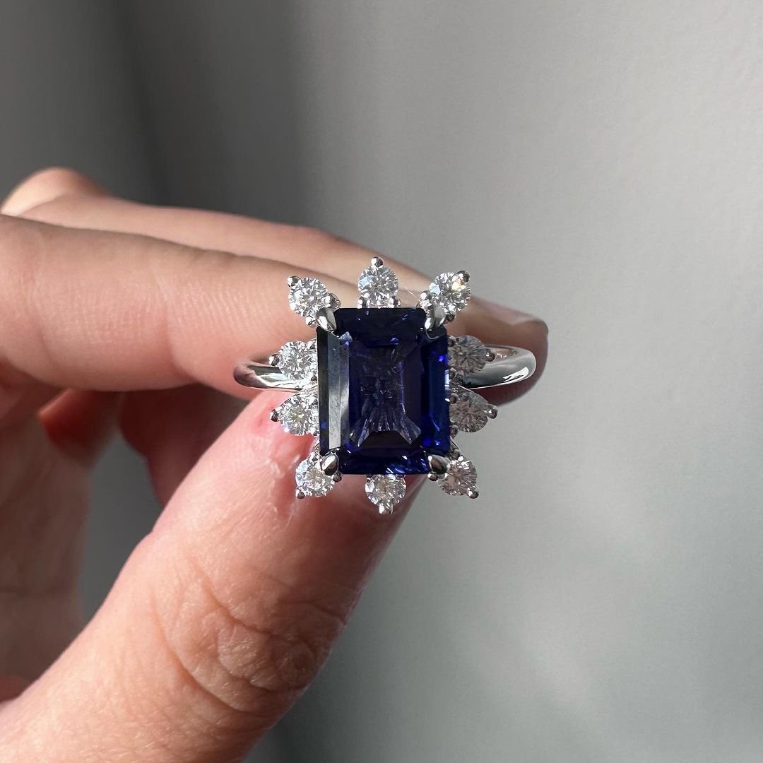 - 10 Dazzling Moissanite Accents: Framing the royal blue gemstone like a celestial halo, these moissanite accents add a touch of mesmerizing brilliance and fire.