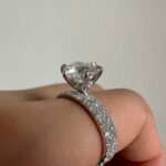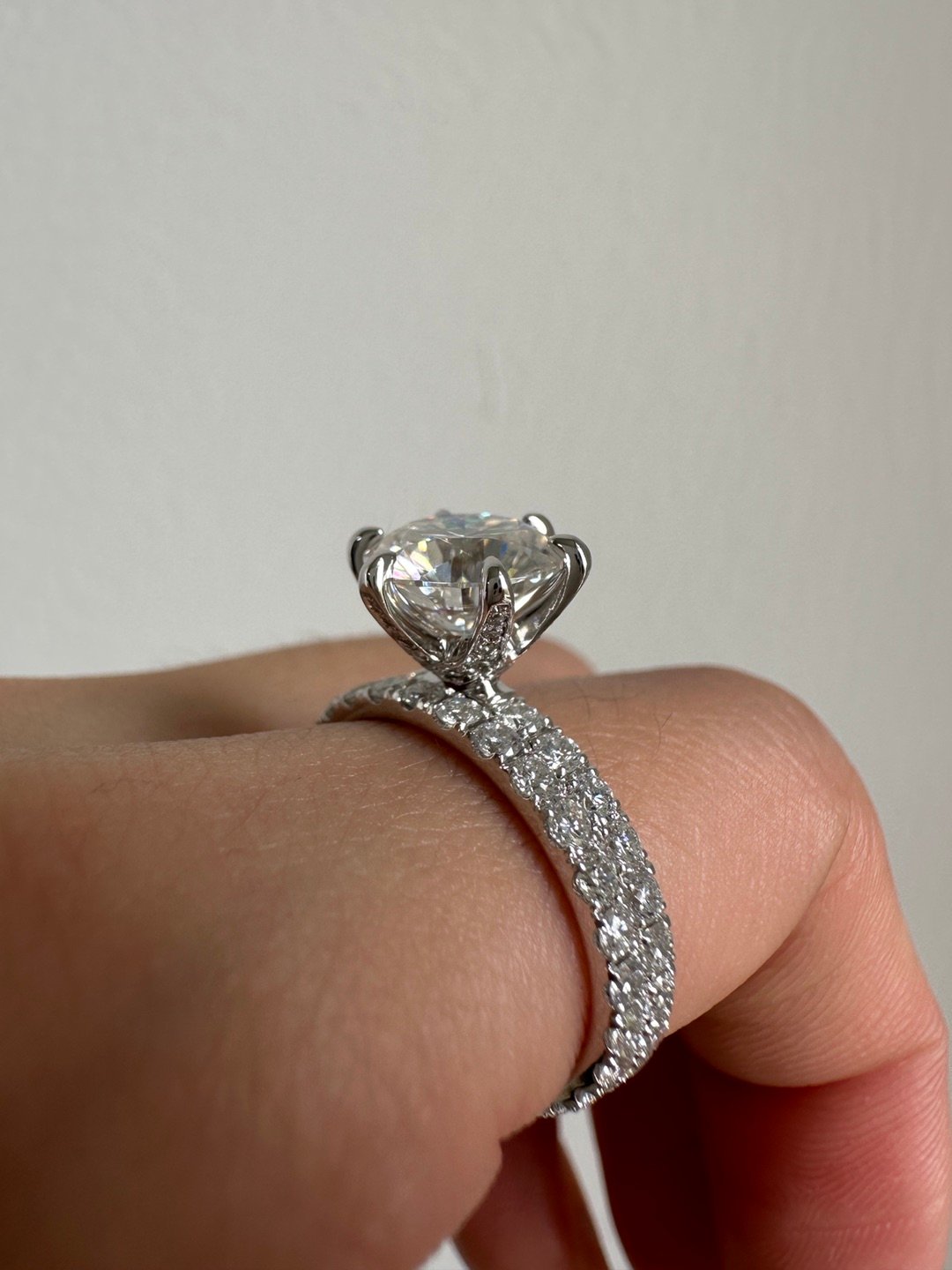 Pavé moissanite sparkles around one half of the ring on this classic engagement ring. The gallery of moissanites and the graceful claw claw setting encircle the round cut moissanite in the centre, glowing like love!