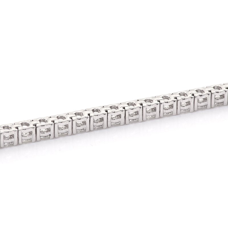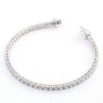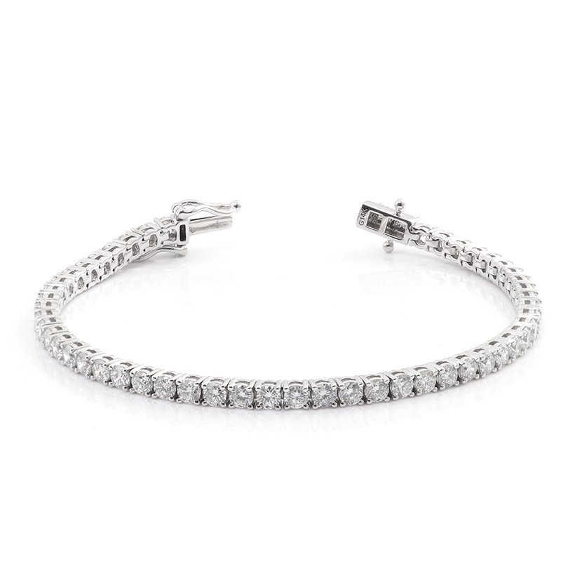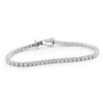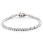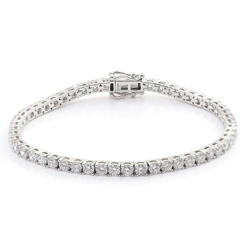 *This eye-catching tennis bracelet embellishes the wrist with 4.4CTW of shimmering moissanites individually set in lustrous white gold links.