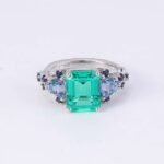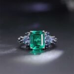 Its verdant depths beckon, each facet reflecting light like a miniature emerald palace. But this queen isn’t alone. Two opulent trillion-cut sapphires, their generous proportions adding a touch of playful grandeur, flank her sides. These are not mere courtiers; their rich hues and intricate cuts echo the emerald’s brilliance, creating a mesmerizing dance of color.
