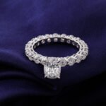 This style is surprisingly extravagant, with a radiant cut moissanite accenting the centre, making the whole ring too strikingly shiny.
