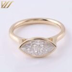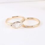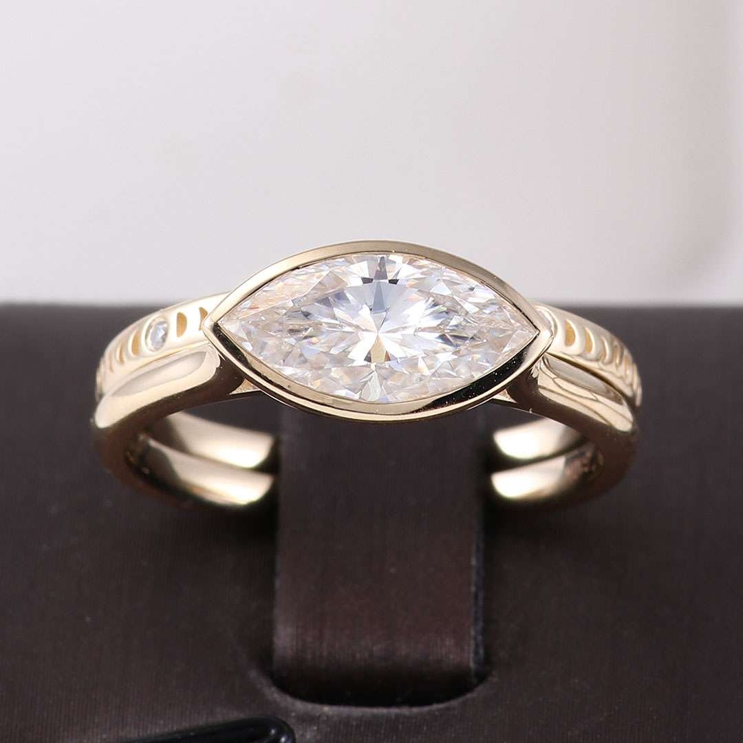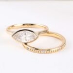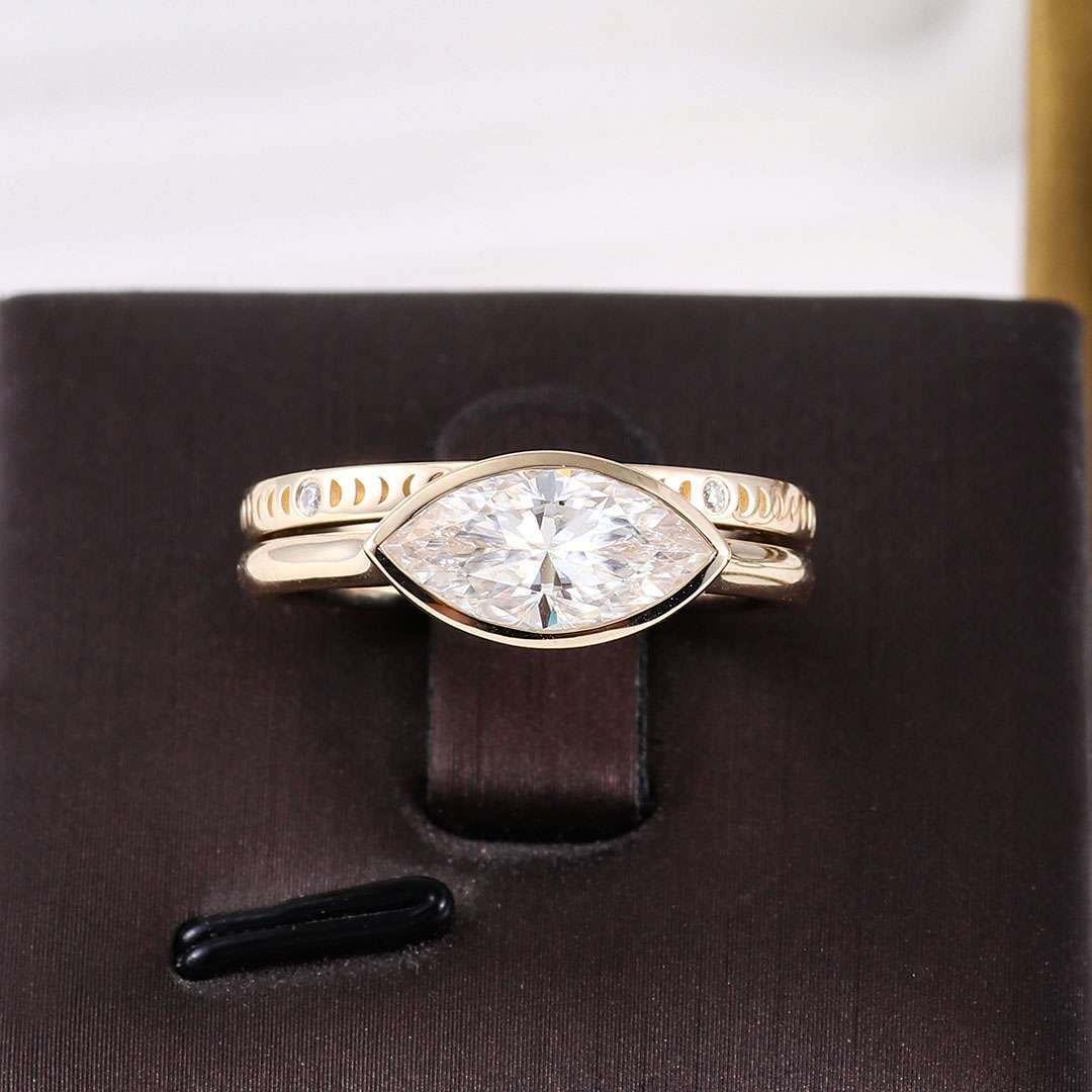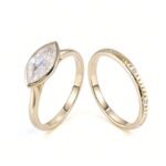 A captivating symbol of your love story, the Marquise Bezel Ring Set embodies timeless elegance and the brilliance of everlasting commitment. This exquisite set features two rings, each meticulously crafted to celebrate your happily ever after. A captivating marquise cut gemstone takes center stage, its elongated silhouette exuding sophistication and fire unlike any other. The bezel setting offers a touch of modern flair while protecting the gem’s brilliance for a lifetime of cherished wear.