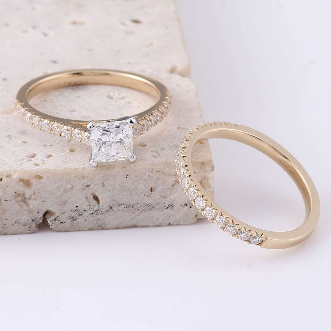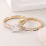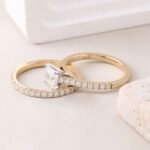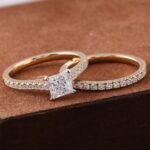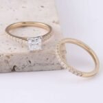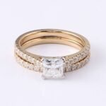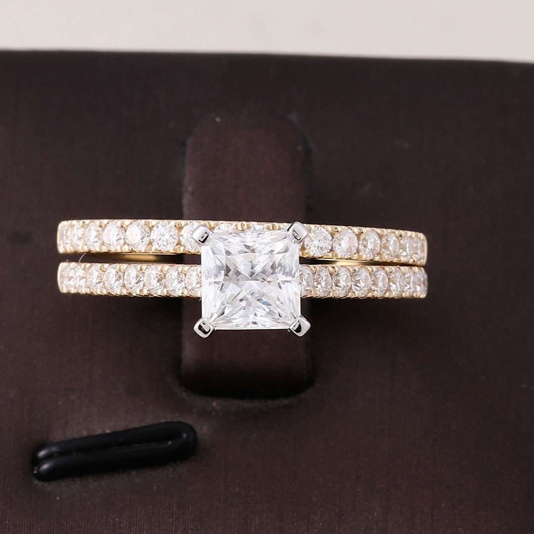 The Princess Cut Eternity Band Wedding Ring Set transcends fleeting trends, showcasing the timeless elegance of princess cut diamond in a captivating two-ring ensemble. Dazzling princess cut moissanite take center stage, boasting exceptional fire and brilliance with every facet. Their geometric design exudes a modern flair, creating a dazzling display of light that captures the eye and reflects the unwavering nature of your love.