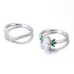 The Pear Moissanite and Emerald Trilogy Ring features a mesmerizing 6x9mm pear-shaped moissanite at its center, flanked by six delicate horse’s-eye emeralds, resembling leaves cradling a teardrop of brilliance. This unique design evokes a sense of organic elegance, symbolizing a love story flourishing amidst the beauty of nature. Three delicate horse’s-eye emeralds grace each side of the moissanite, resembling leaves cradling a precious gem. Their vibrant green hues add a touch of organic elegance and symbolize growth, prosperity, and new beginnings – perfect for celebrating the blossoming of your love story.
