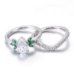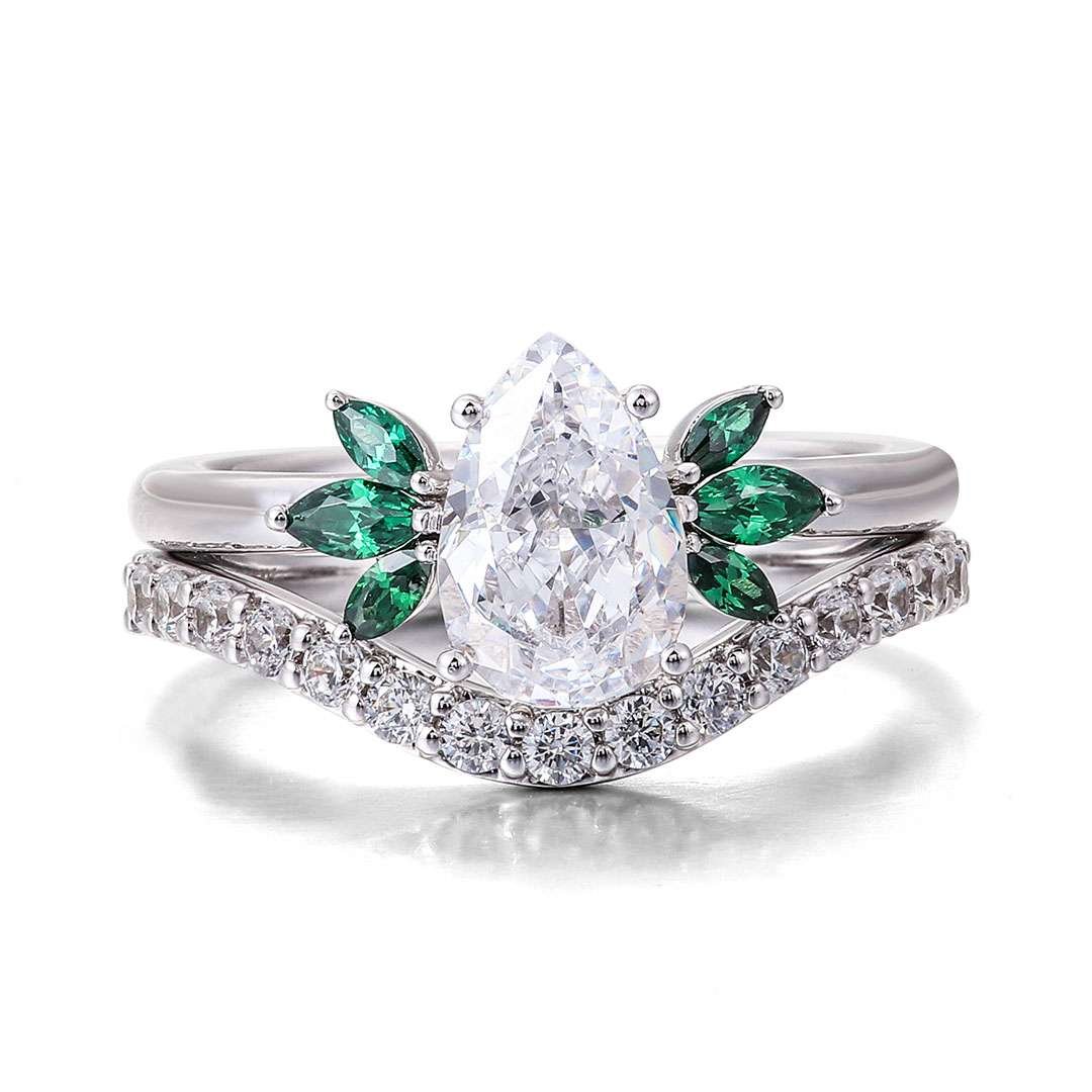 6x9mm Pear Moissanite and Emerald Trilogy Ring Set
