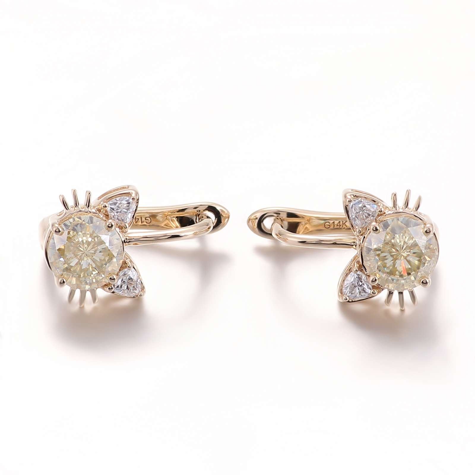 These charming Cat Moissanite Stud Earrings feature a delightful cat design, perfect for animal lovers and fashion enthusiasts alike. Each earring showcases a sparkling 5mm round moissanite stone, accented by four 2x2mm triangular moissanites that enhance the playful aesthetic. The unique cat ear shape, combined with the brilliance of moissanite and the warm hue of rose gold, makes these earrings a whimsical yet elegant addition to any jewelry collection.”