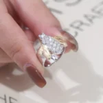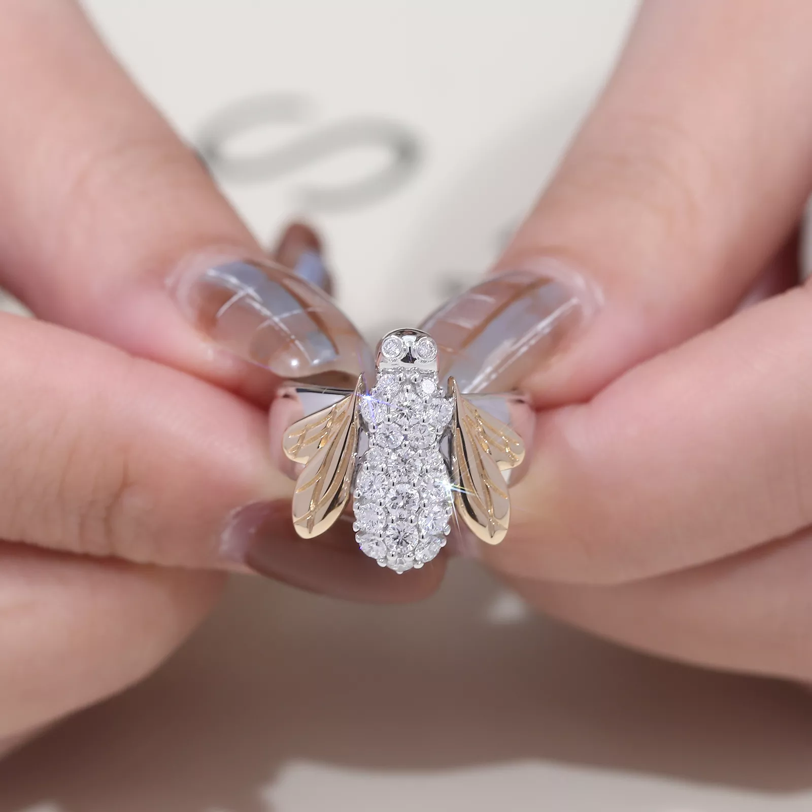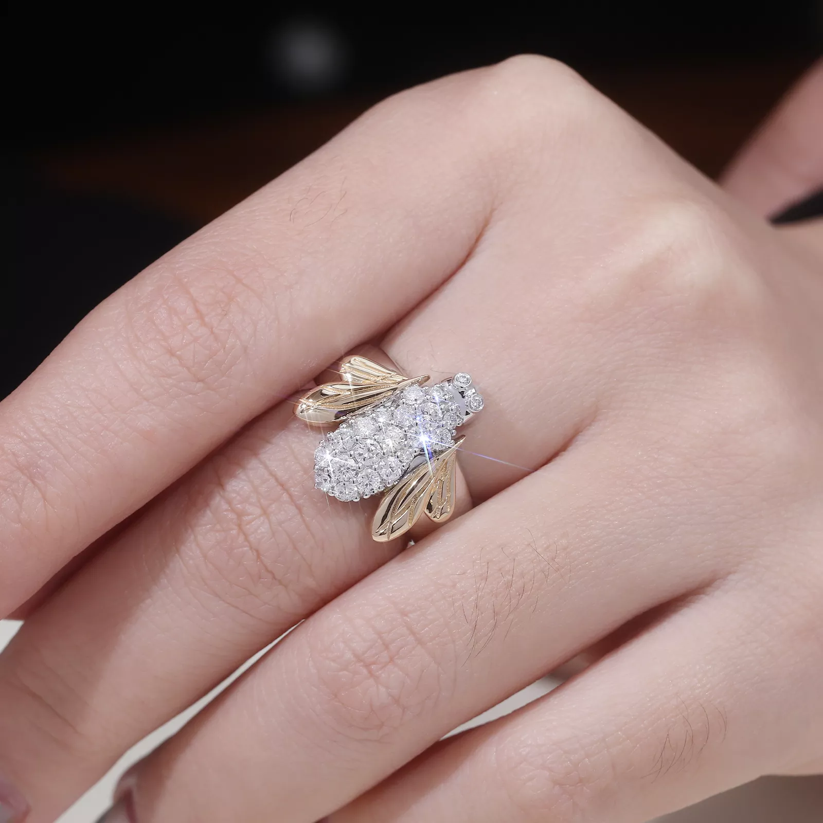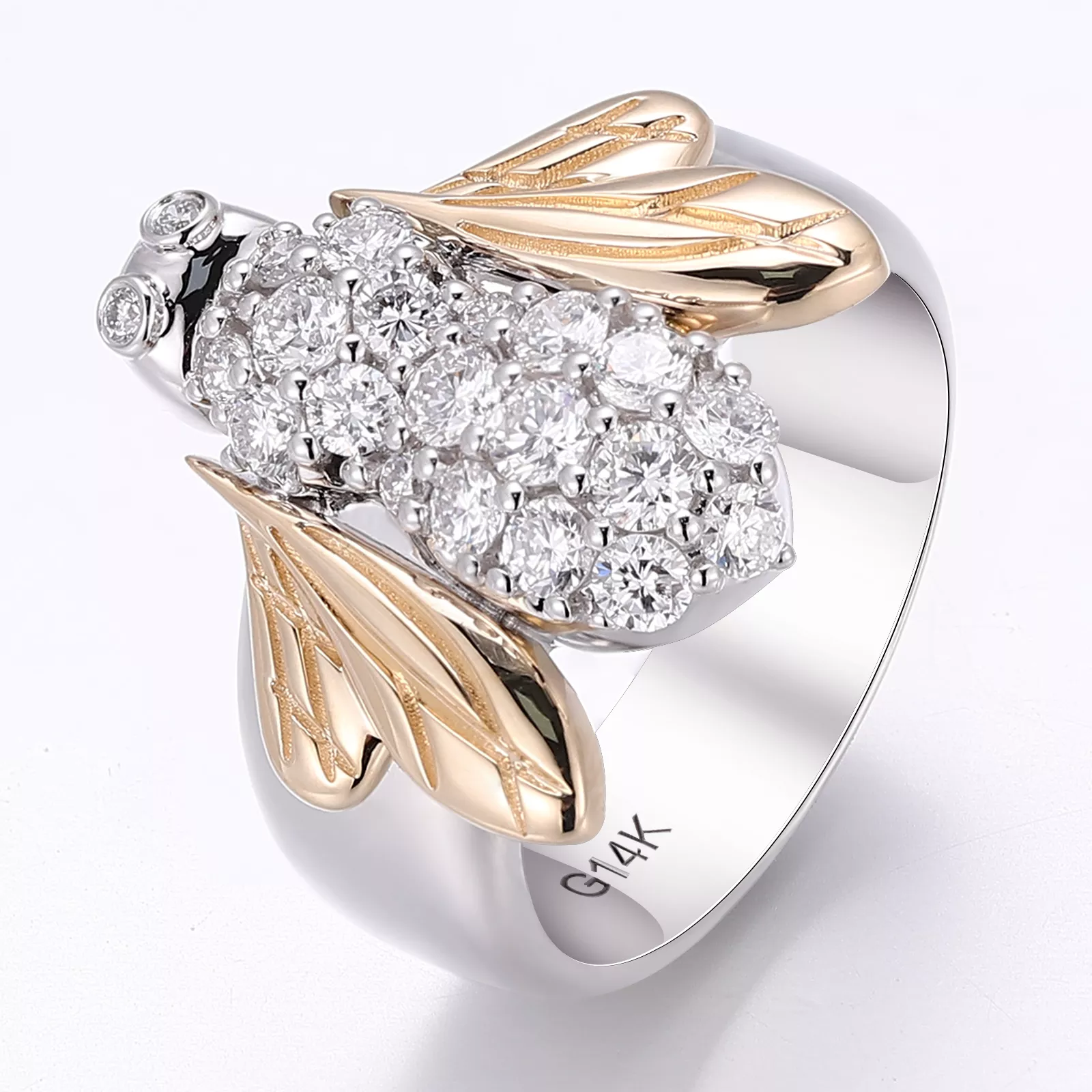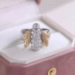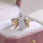 Sculpted Bee Motif Ring meticulously sculpts a lifelike bee form in contrasted metals: cool tone body pavé-set with brilliant round-cut moissanites mimicking iridescent bristles, while warm tone wings and accents symbolize golden nectar traces.This zoomorphic metamorphosis celebrates nature’s genius through artisanal metalwork, where light dances on every curve and facet.
