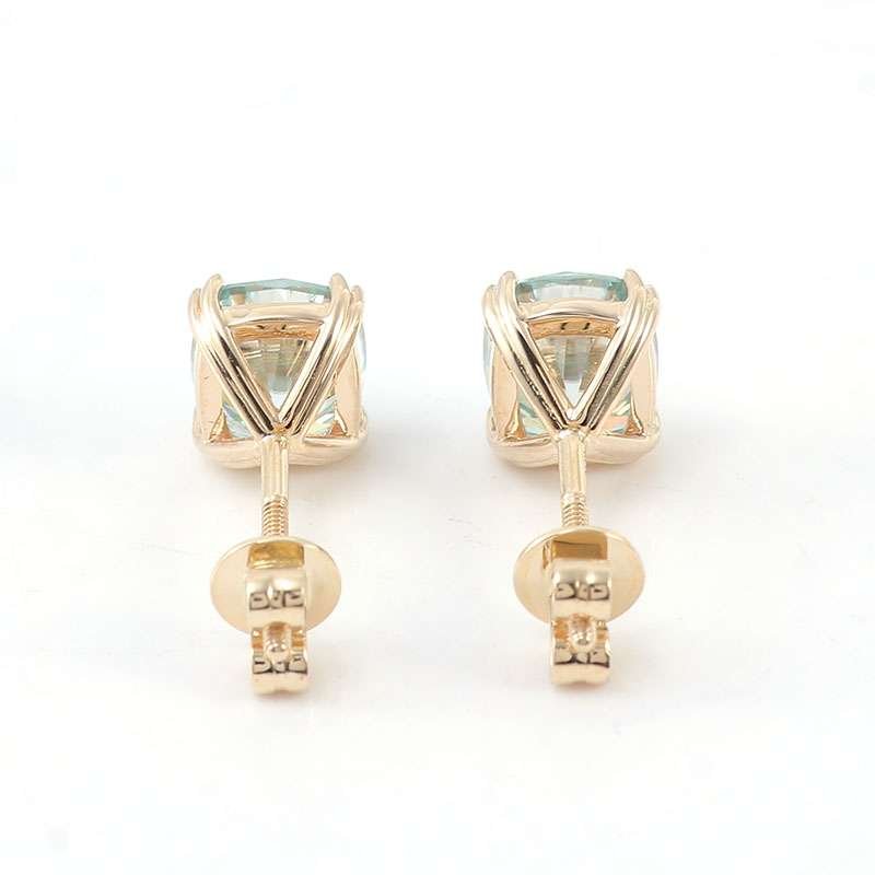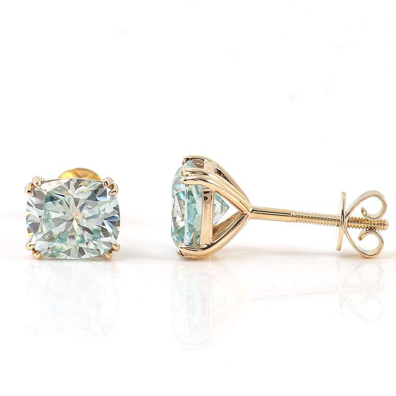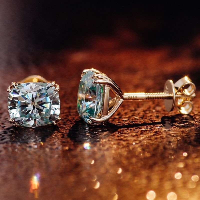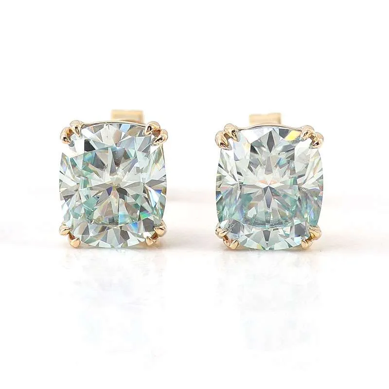 BLUE GREEN Cushion Cut Moissanite Yellow Gold Stud Earrings