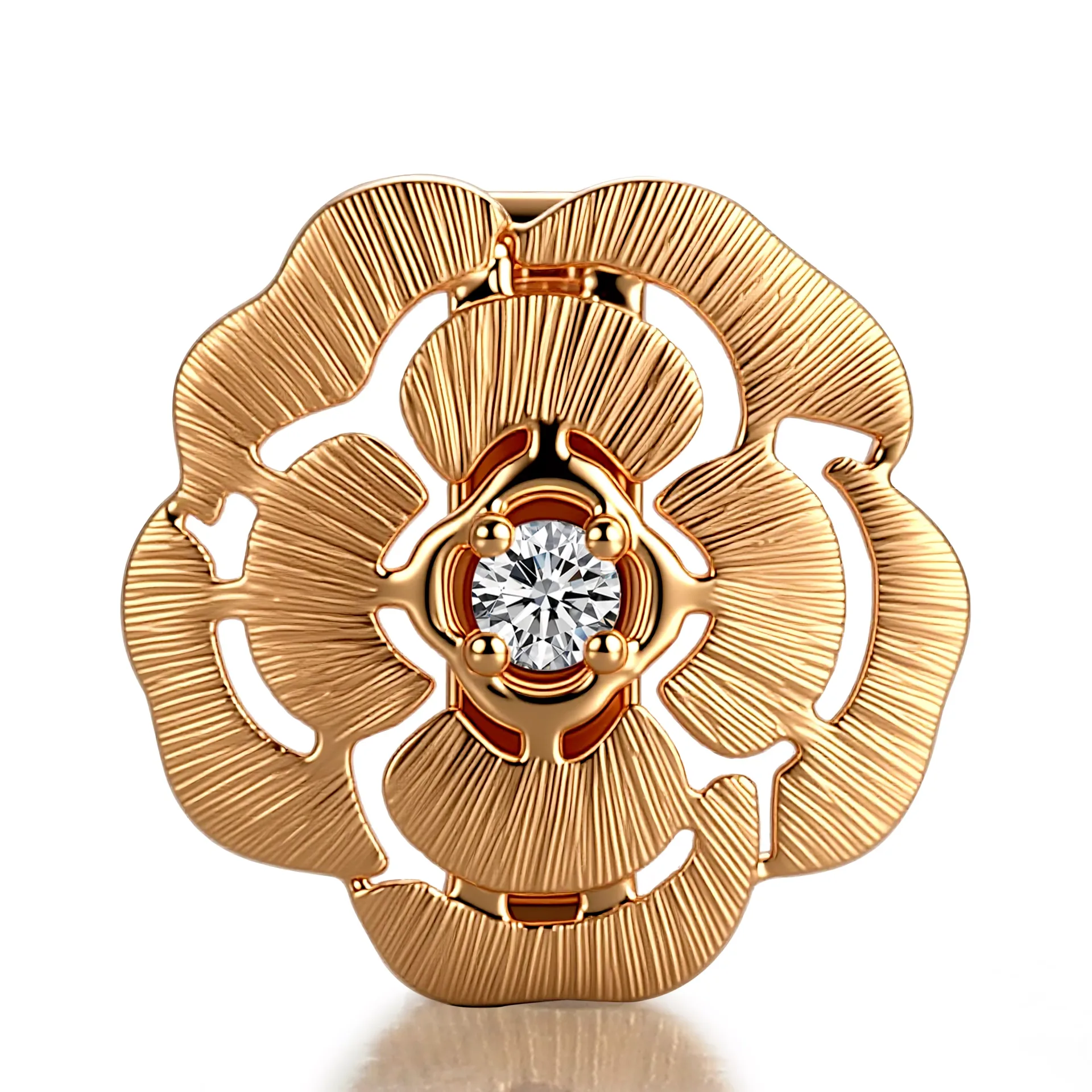 The Camellia Bloom Pendant captures the delicate beauty of a camellia flower in 18K yellow gold, featuring softly curved petals with fine longitudinal brushing for tactile texture. At the center, a round-cut lab diamond is secured by four polished prongs, its brilliant facets reflecting icy sparks against the warm gold. The pendant’s openwork design allows light to flow through the floral form. Designed as a pendant-only piece— embodying nature-inspired elegance through ethical luxury.