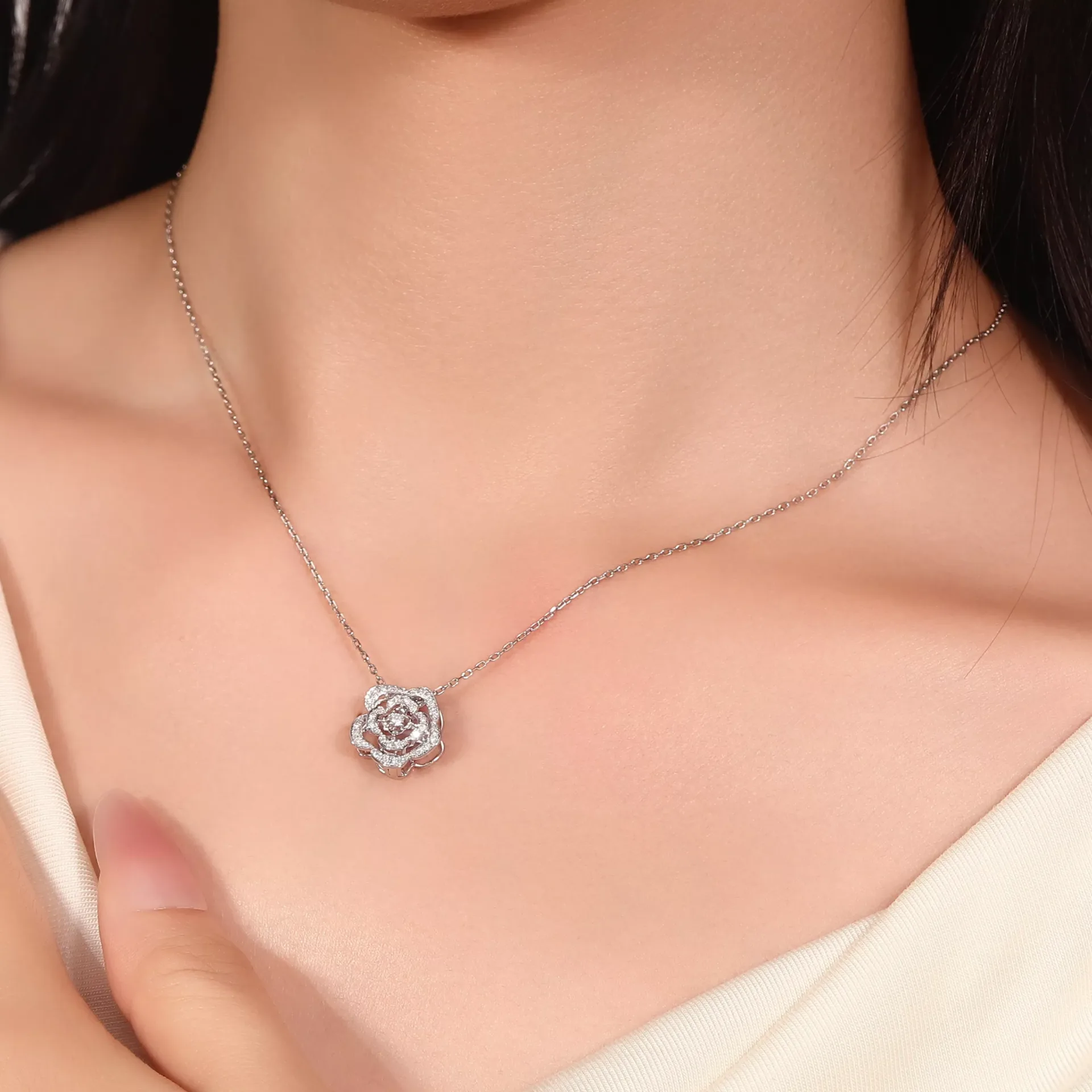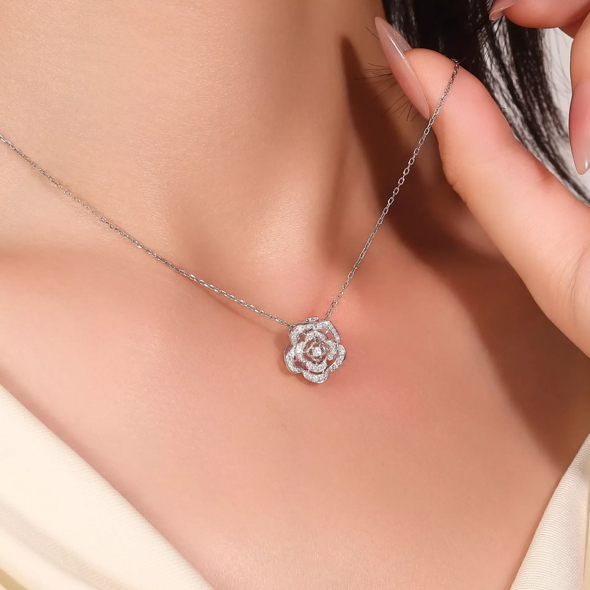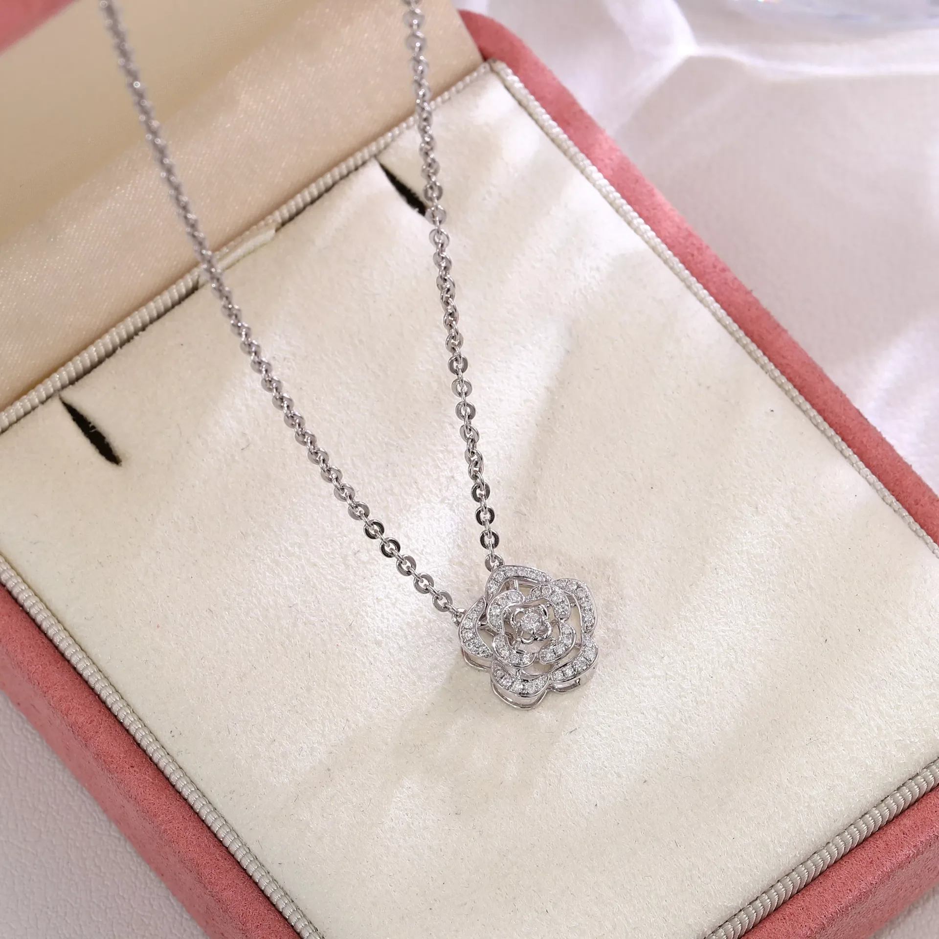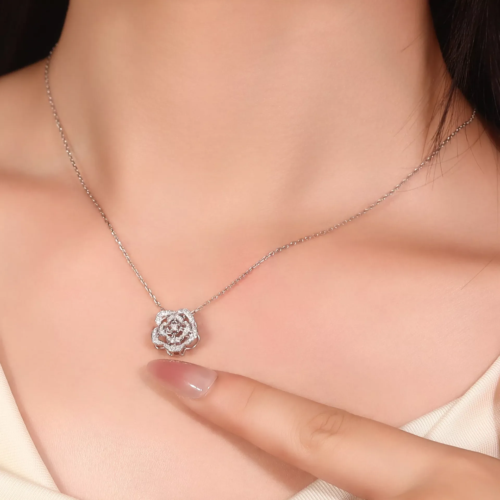 The Camellia Clasp Pendant embodies botanical elegance through an 18K white gold camellia flower clasp pavé-set with round-cut lab diamonds. Each petal is meticulously layered and edged with micro-prong settings, centering a prominent lab diamond that anchors the floral motif. This piece harmonizes nature-inspired artistry with ethical luxury. Against pure white backdrop, the necklace drapes with timeless grace, symbolizing purity and refined beauty.
