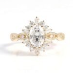 Behold this spellbinding yellow gold halo ring! At its core, an oval cut moissanite sparkles brilliantly, surrounded by a halo of delicate moissanite accents in varied cuts. The intricate yellow gold band, with its vintage inspired details, weaves romance and sophistication into one piece. Perfect for engagements, special anniversaries, or to add a touch of old world glamour to your style. Forged from premium yellow gold, it ensures lasting beauty and a radiant shine. A must have for those who adore vintage – inspired jewelry with a modern, dazzling twist.