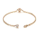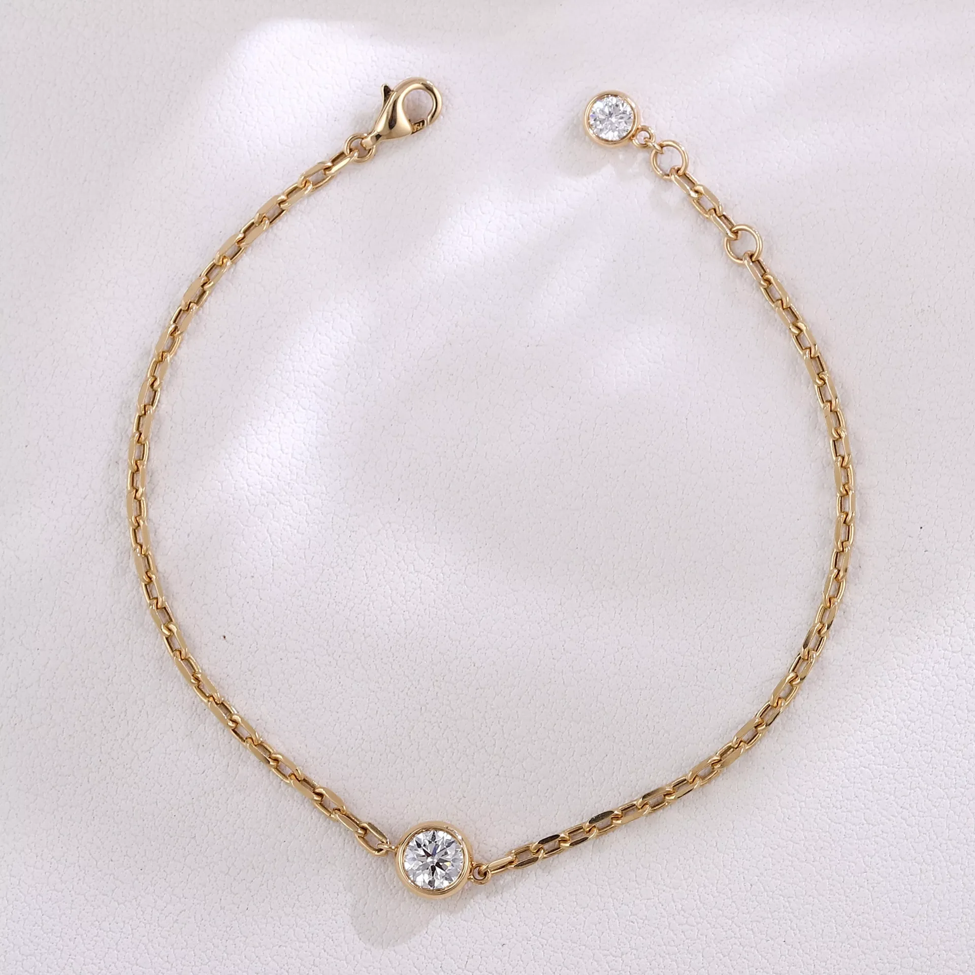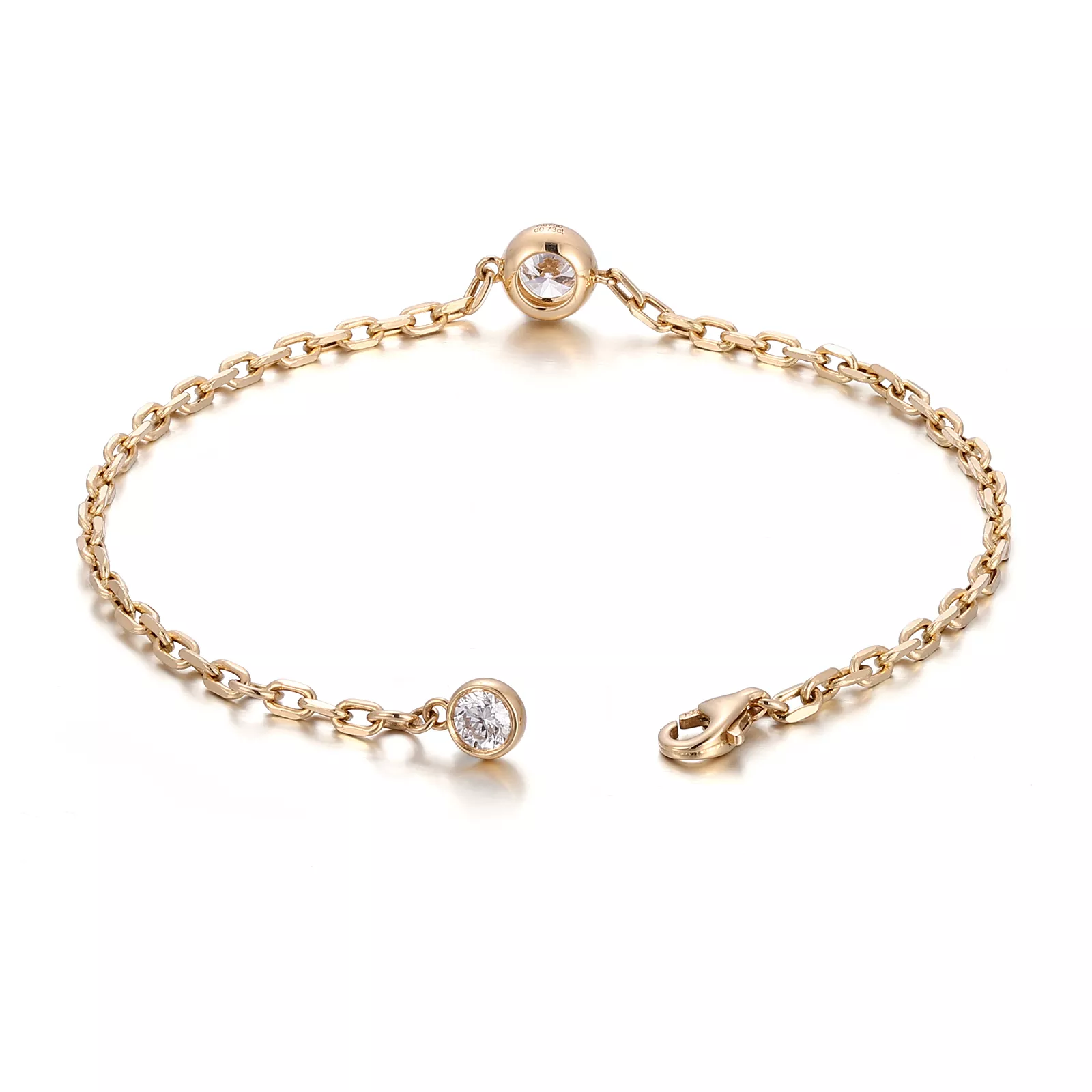 This 18K yellow gold Lab Diamond Bracelet combines a sleek trace chain design with two round-cut lab diamonds — one positioned at the center of the chain. The diamonds are set in minimalist bezel settings to maximize light exposure and brilliance, creating a subtle yet captivating sparkle against the warm gold links. The bracelet’s lightweight construction and polished finish ensure comfortable daily wear. Ideal for layering or solo wear, this piece embodies understated elegance.