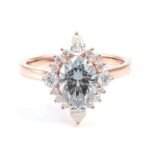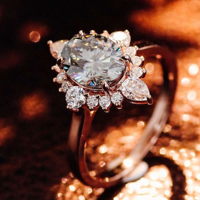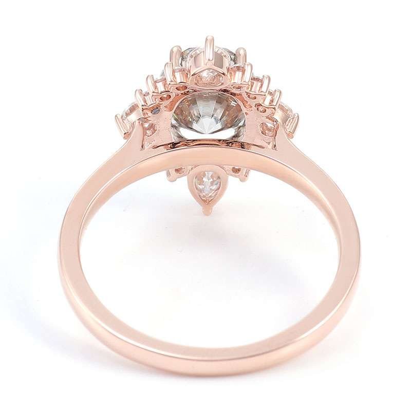 Be captivated by this Oval Cut Ring. The VVS clarity oval cut moissanite at its center is surrounded by a cluster of pear shaped and round – cut moissanite stones, creating a beautiful floral like design. Set in lustrous rose gold, the ring exudes a soft and romantic glow, making it an excellent choice for those who want a unique symbol of their love.