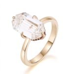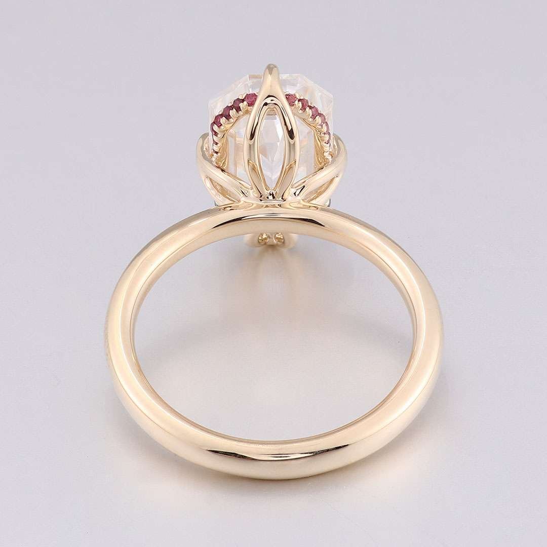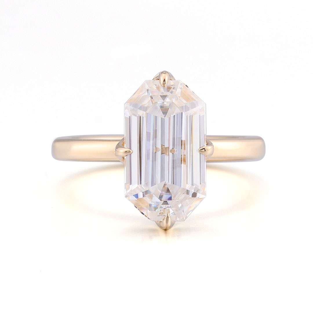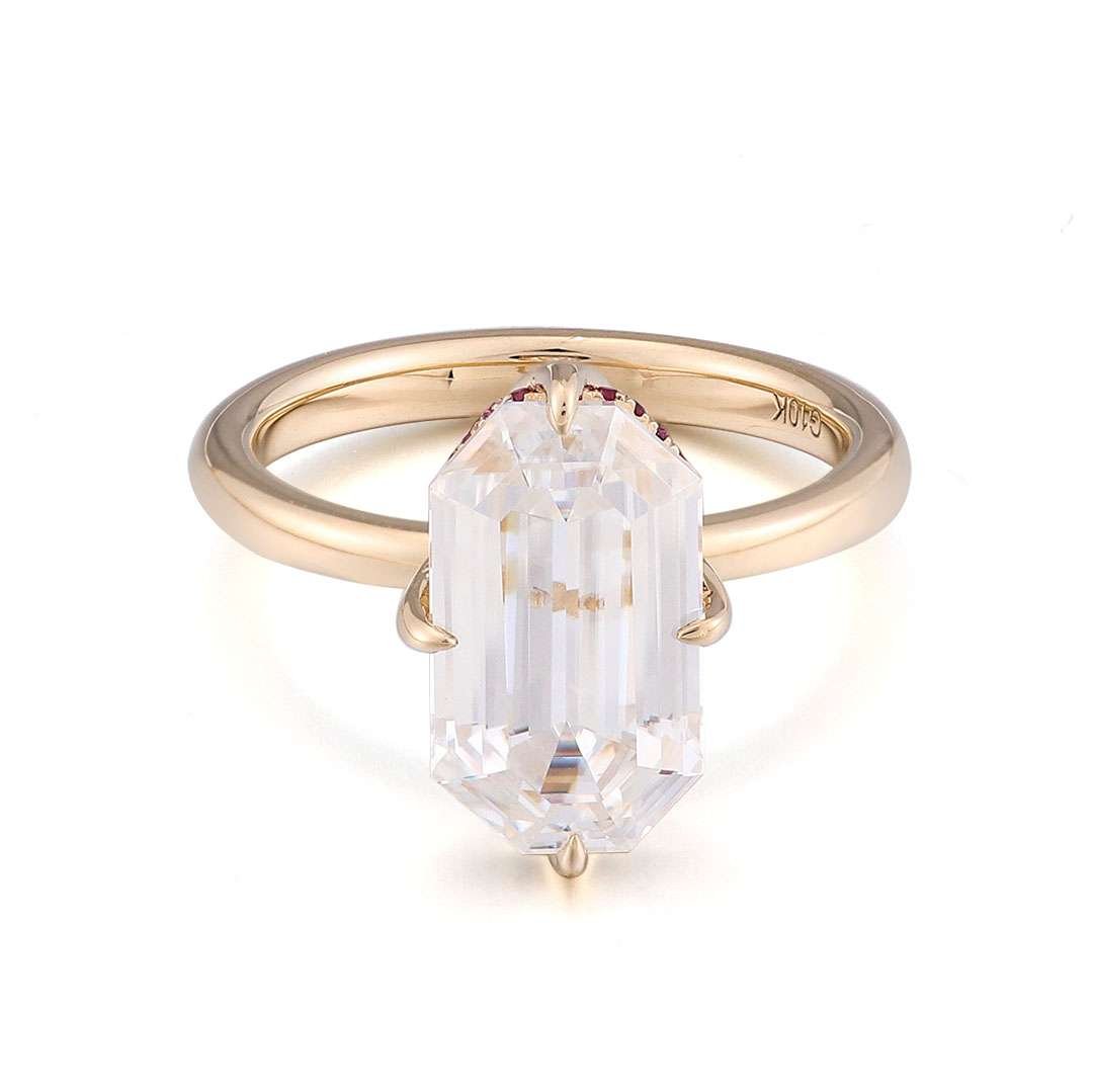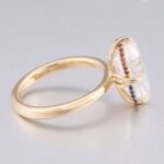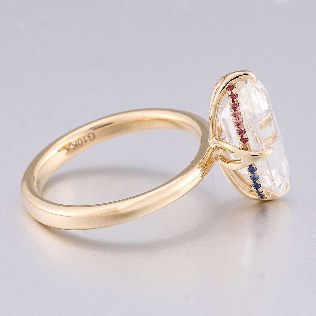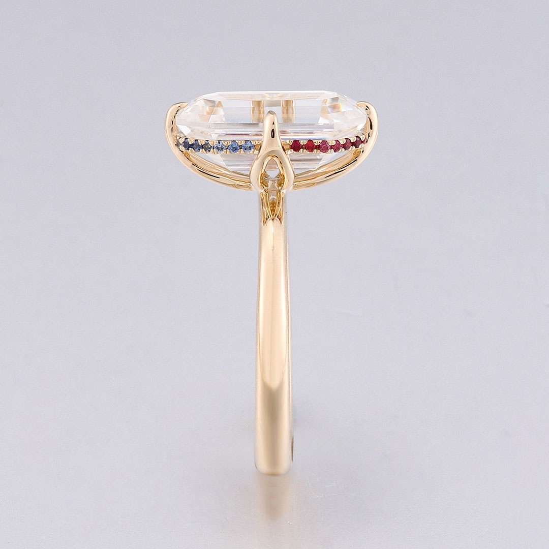 ThisYellow Gold Moissanite Ring features a VVS clarity moissanite stone set in elegant yellow gold. What sets it apart are the charming red and blue moissanite accents adorning the sides of the main stone, creating a captivating and unique look. The combination of the brilliant moissanite and the warm yellow gold, along with the colorful moissanite details, makes this ring a truly dazzling piece that will add a touch of sophistication and allure to any outfit.