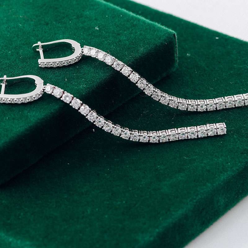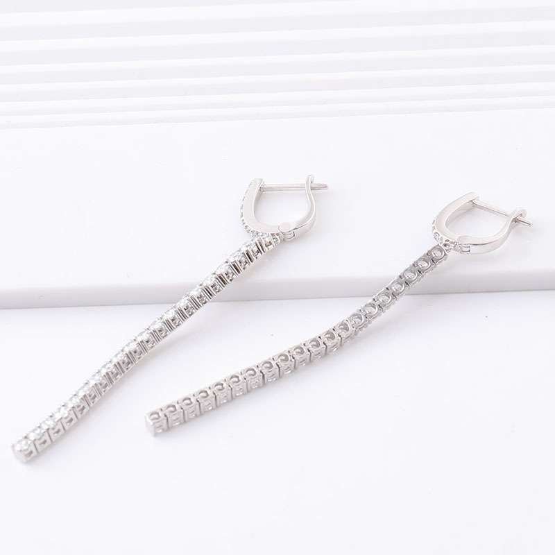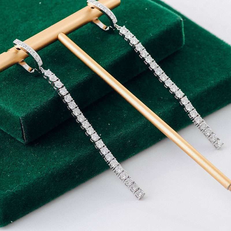 Elevate your style with our Chic Linear Drop Earrings, showcasing a stunning cascade of moissanites set in 14K white gold. These earrings feature a row of 2.8mm moissanites leading to a long, linear arrangement of 2.7mm stones, culminating in a 2.8mm stone at the bottom. The result is a sophisticated, elongating effect that adds a touch of glamour to any outfit. Perfect for special events or as a statement piece for everyday wear, these earrings exude elegance and grace.