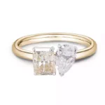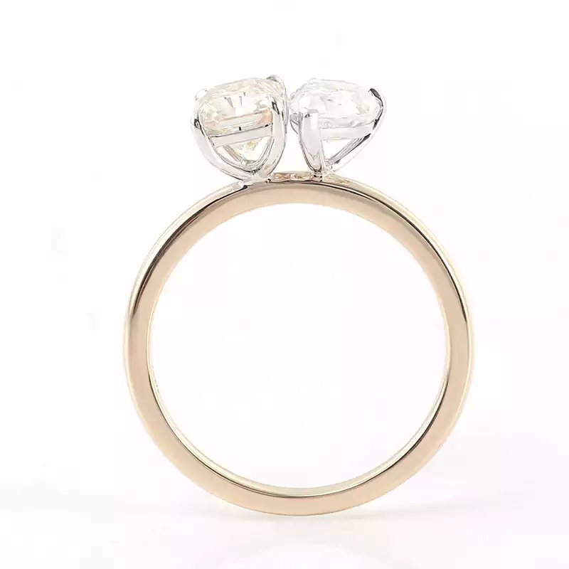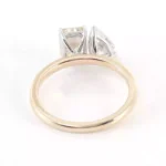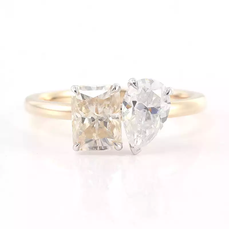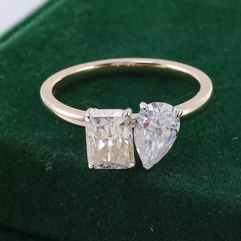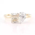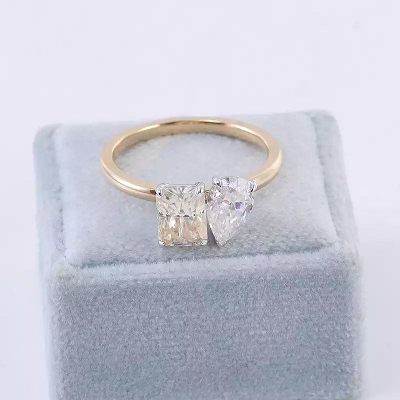 Embrace the duality of love with our chic moissanite toi-et-moi ring. This beautifully crafted piece features a radiant yellow gold band adorned with two mesmerizing moissanite stones – one radiant-cut and one pear-shaped – representing the harmony between two souls. Perfect for engagements, milestones, or as a token of appreciation, this ring exudes elegance and timeless appeal. Elevate your jewelry collection with our captivating moissanite toi-et-moi ring today.