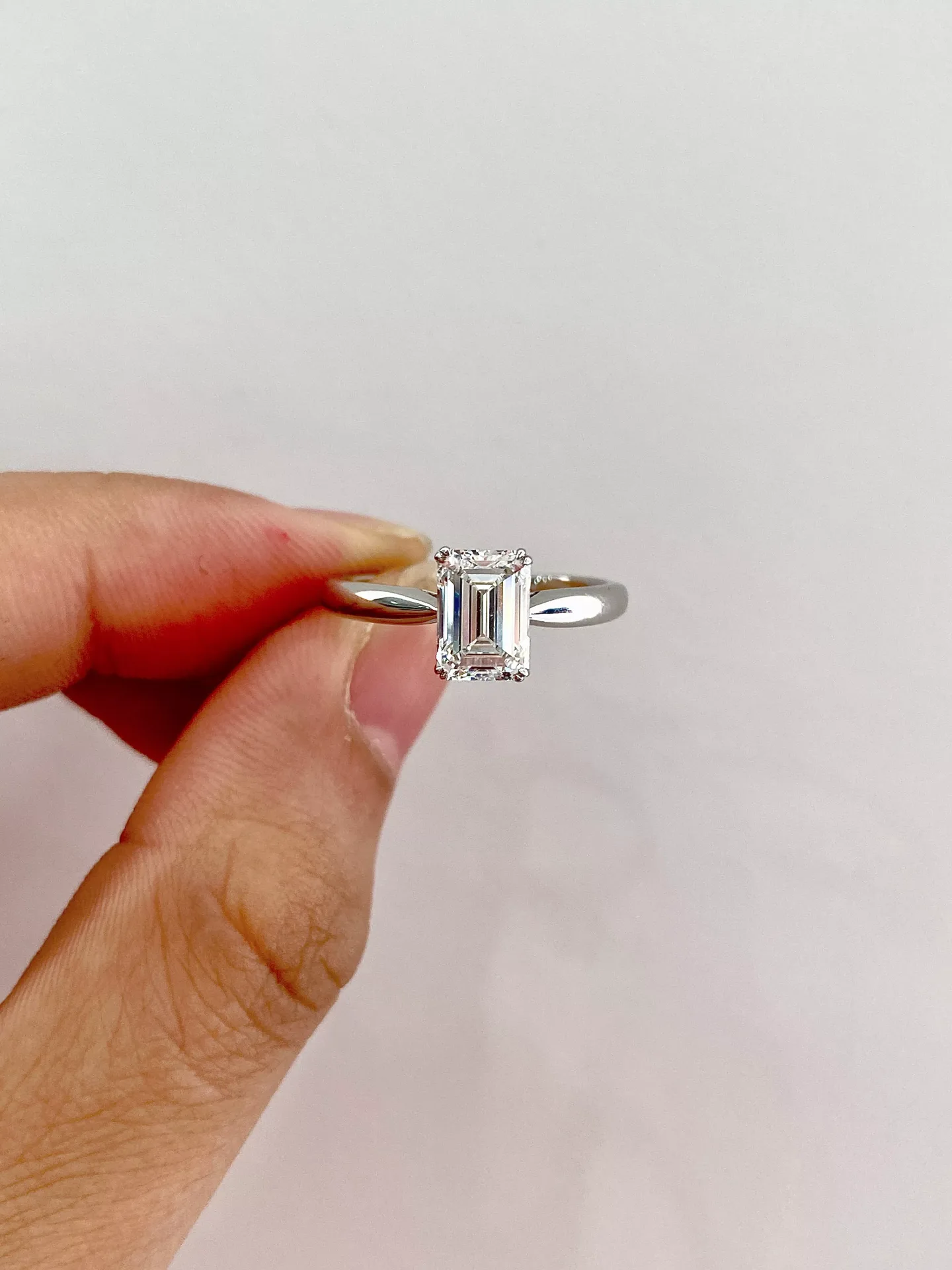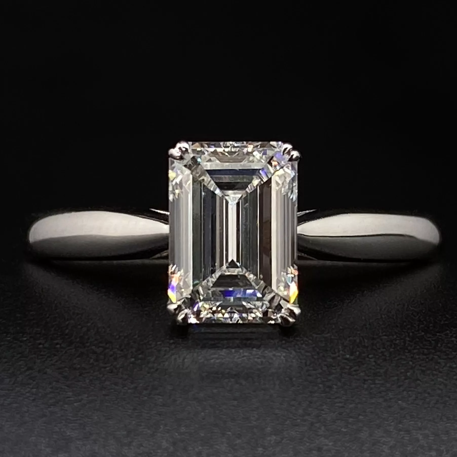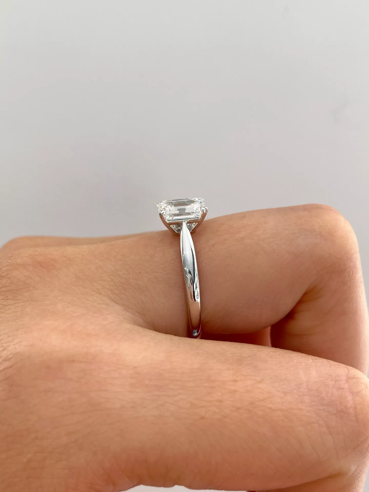 The epitome of understated sophistication. This classic emerald cut lab diamond solitaire ring in 18k white gold is a timeless choice. It features a magnificent emerald-cut lab diamond, celebrated for its mesmerizing “hall of mirrors” clarity and clean, architectural lines. A simple four-prong setting and a sleek, polished band draw all attention to the stone’s beauty. This ethical and minimalist piece is the perfect symbol of a modern, everlasting love.