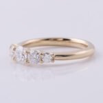 This classic, elegant ring features five round brilliant cut moissanite diamonds set in delicately sculpted shared prongs. This band is the perfect wedding or anniversary ring.