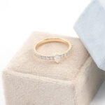 This moissanite ring features round moissanite pavéd in the bezel position on either side of the ring, with a pear moissanite as the centre stone, accenting a striking feel.