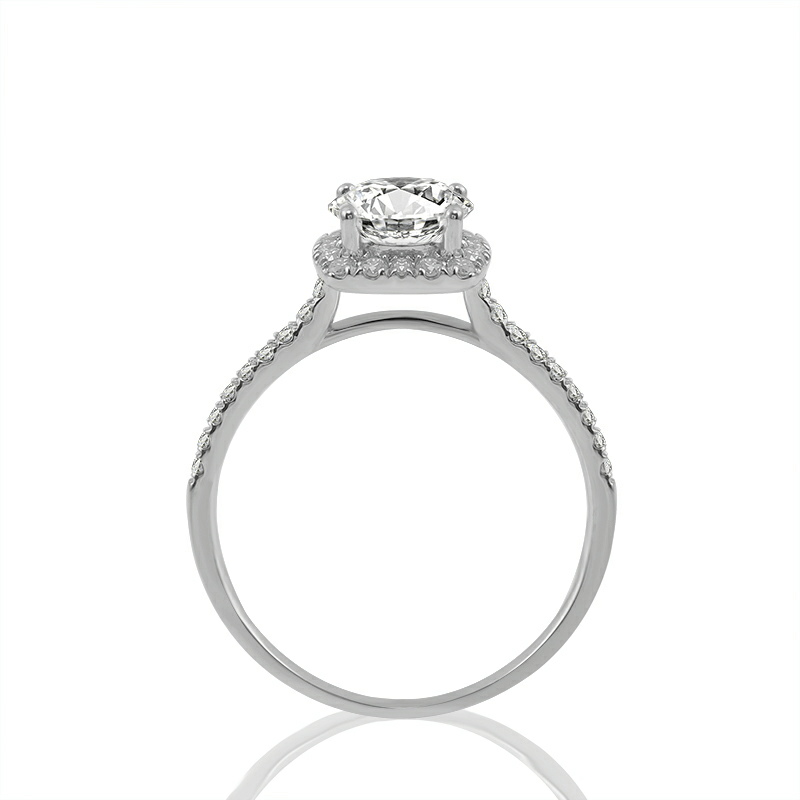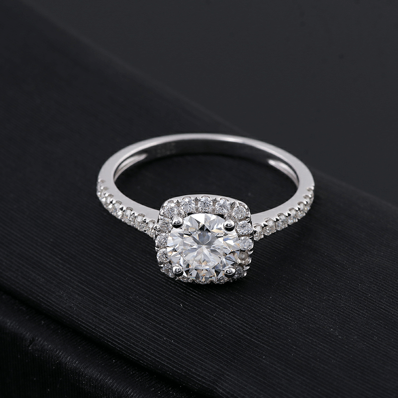 This beautiful Moissanite engagement ring features a classic halo design, a cushion cut Moissanite center stone, and 1.2mm round brilliant Moissanite side stones , set in 10K/14k/18k gold or silver.