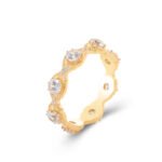 This is a strikingly different look, a popular style right now, with moissanite set into the top of the frame, emitting a shimmering lustre and shooting a different light.