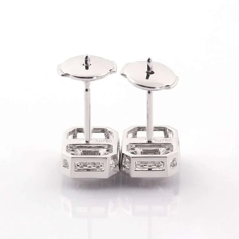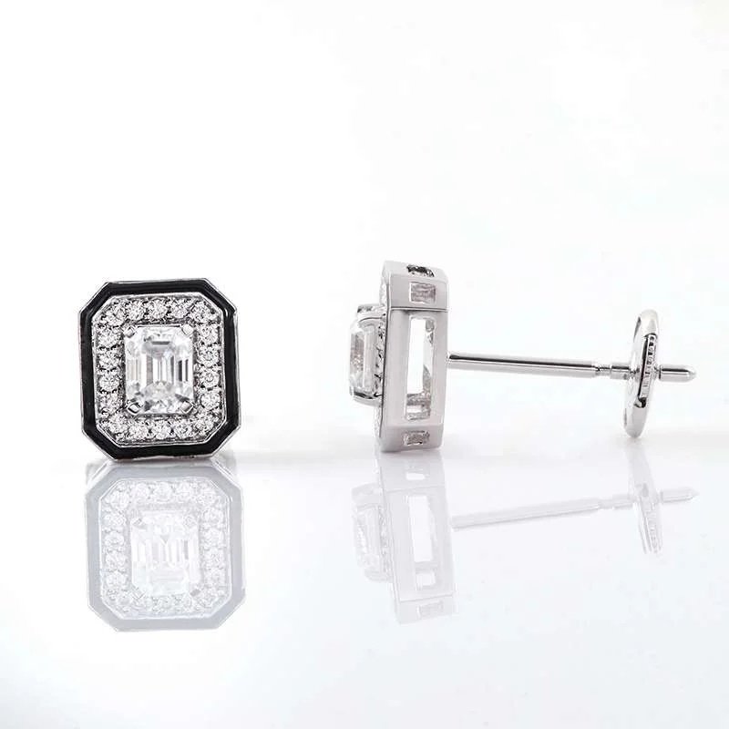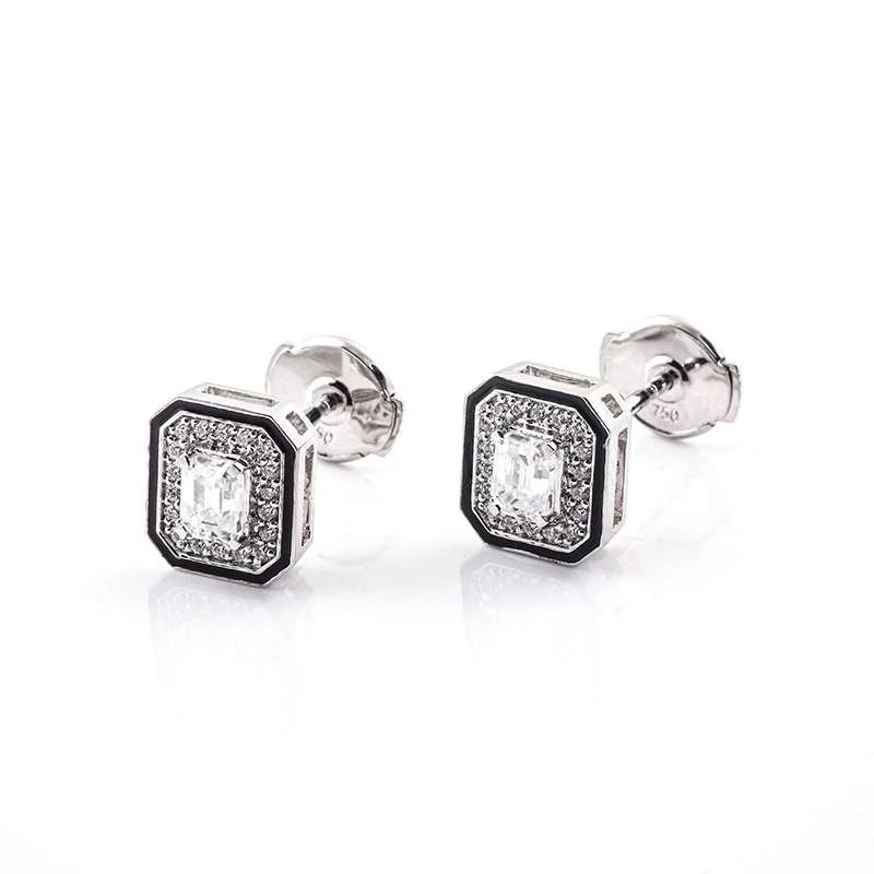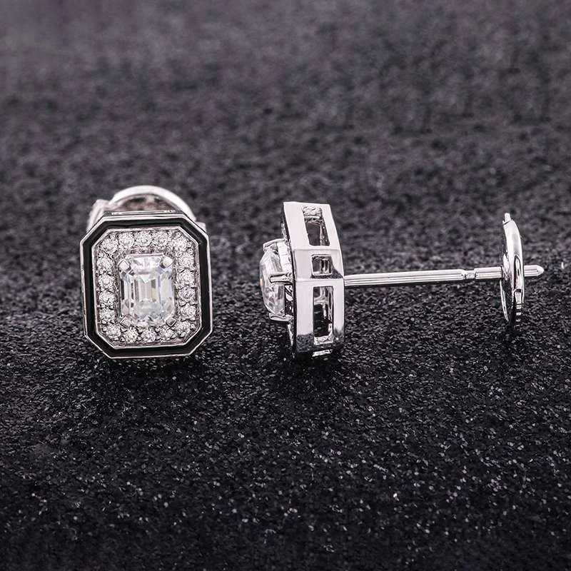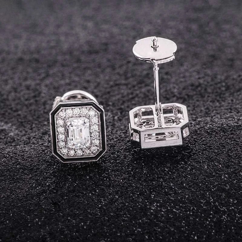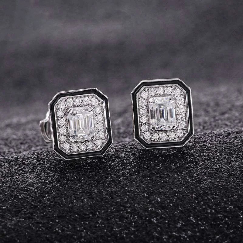These Moissanite Stud Earrings feature emerald cut moissanite stones of VVS clarity, set in white gold. The striking emerald cut of the moissanite gives a sophisticated look, while the surrounding smaller stones add extra sparkle and charm. Perfect for those who appreciate classic and luxurious jewelry, these earrings are sure to make a statement and elevate any outfit.