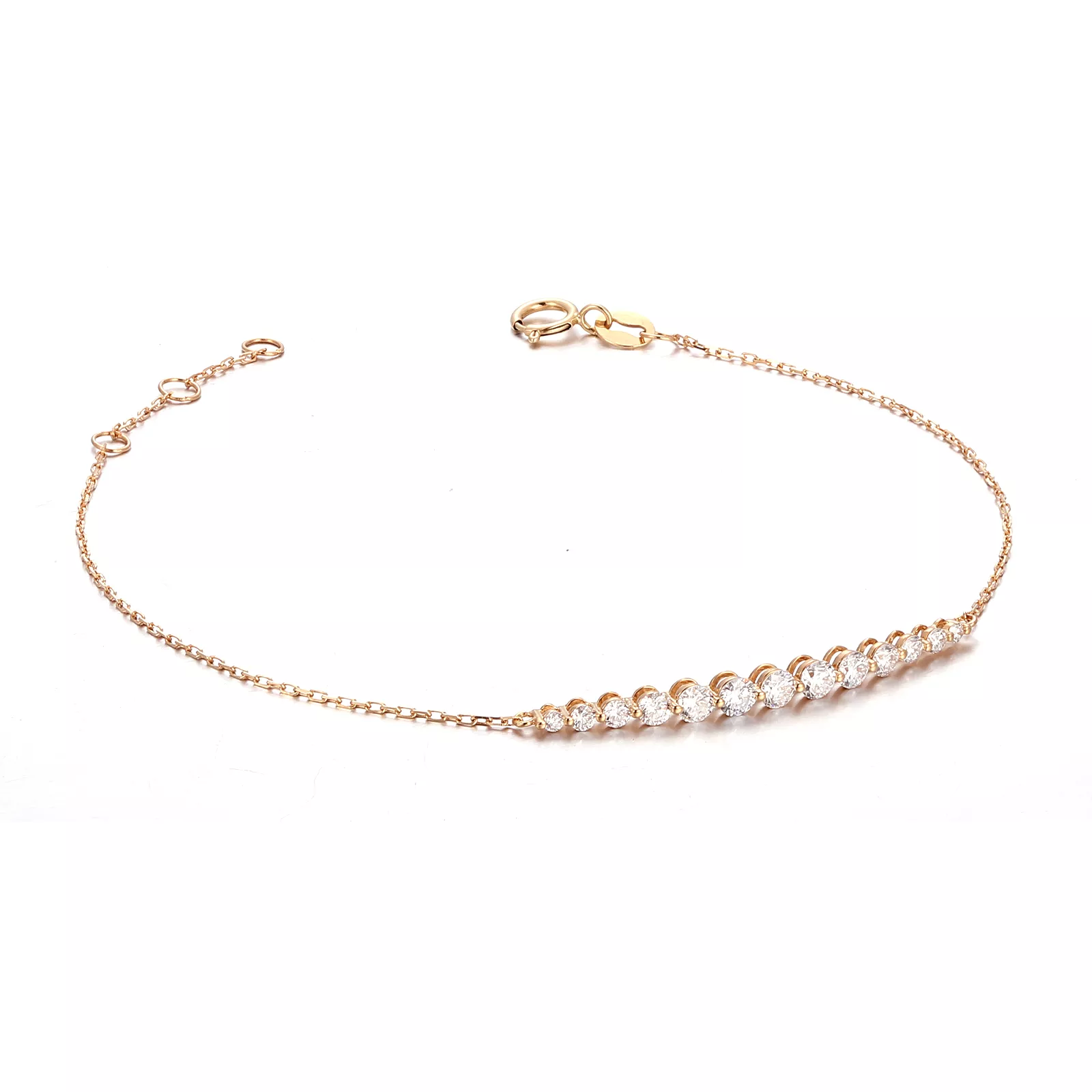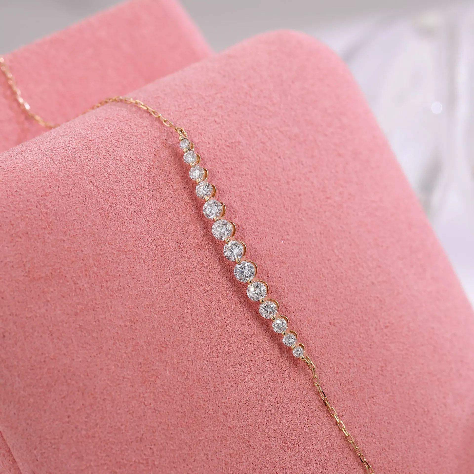 This Diamond Radiance Bracelet features a delicate trace chain adorned with 12 graduated round-cut lab diamonds, meticulously arranged in a central arc formation where the largest stones anchor the center, tapering symmetrically toward the ends. Each diamond is secured in a minimalist setting to maximize light exposure, creating a cascade of ice-white brilliance against the warm gold links. Designed for versatile wear, the piece balances timeless elegance with ethical luxury through its refined proportions and scintillating diamond size gradient.