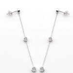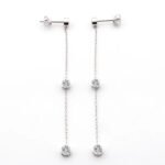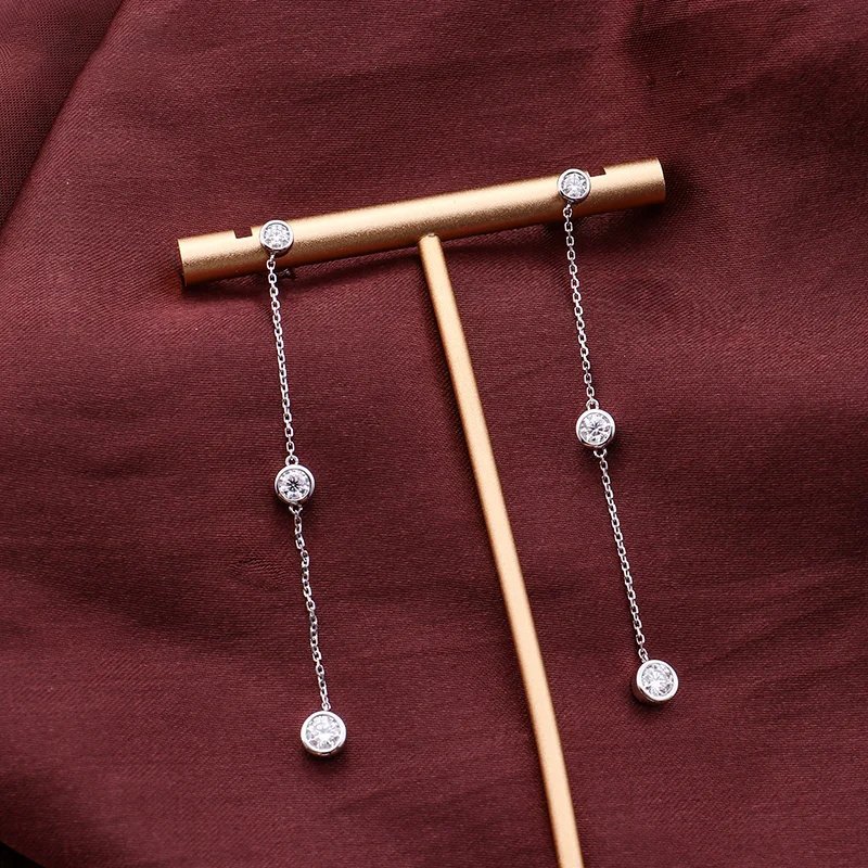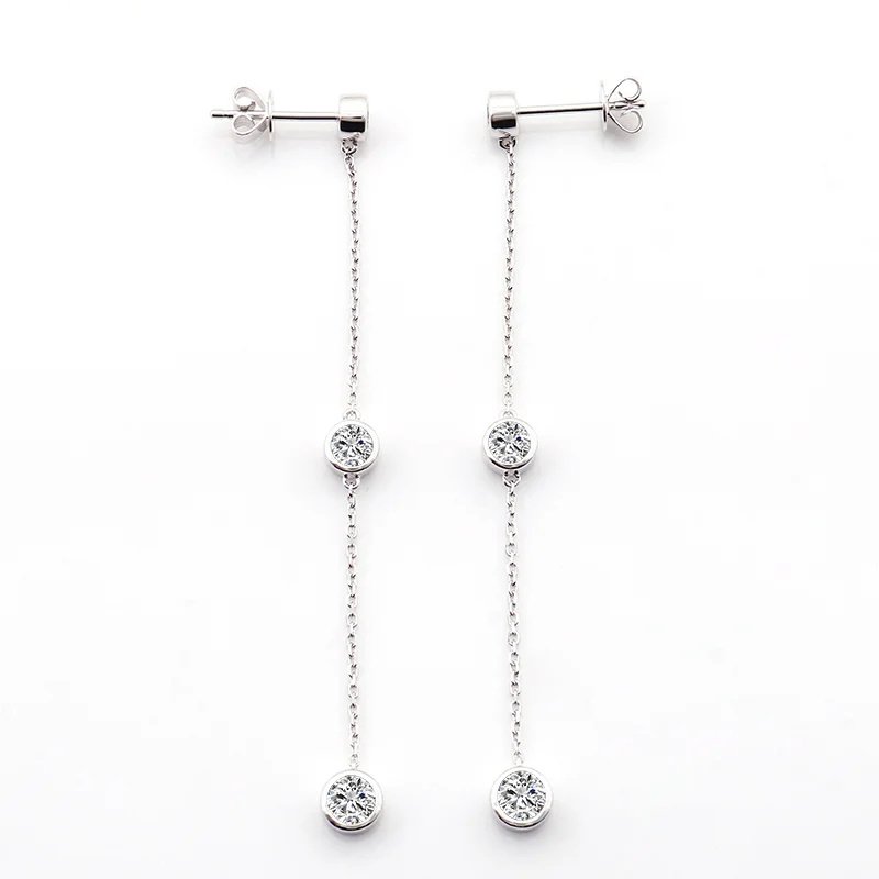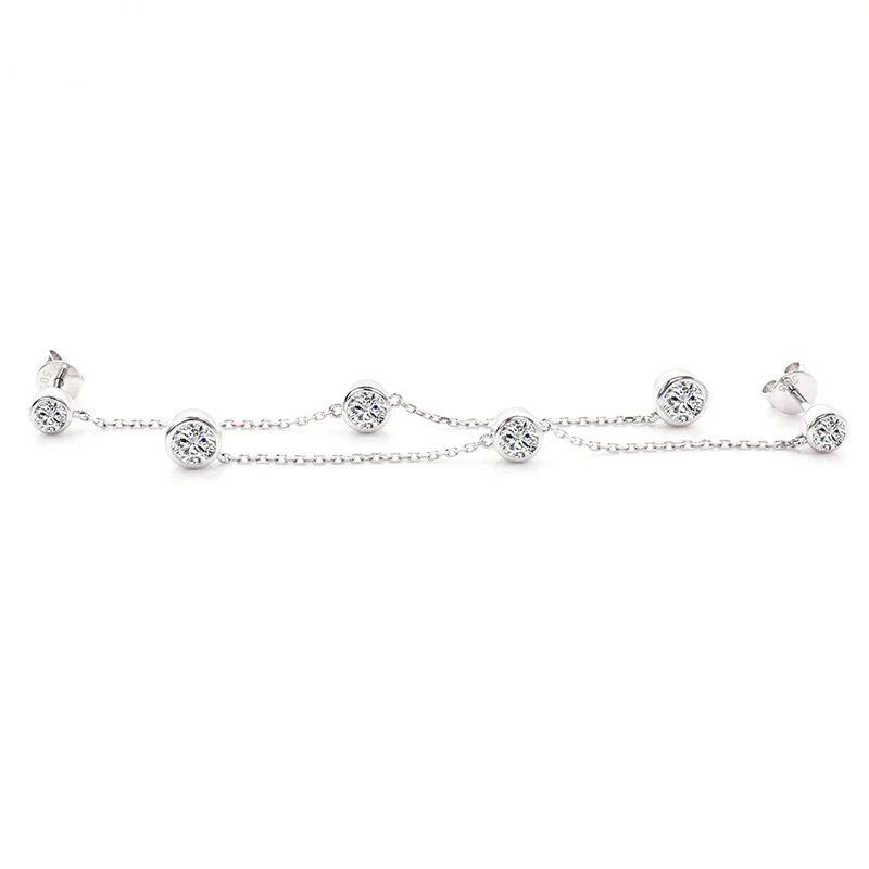 Enhance your elegance with these stunning Moissanite Dangle Earrings in White Gold. Each earring features three sparkling round cut moissanites, bezel set and gracefully dangling from a delicate chain. The earrings, crafted in luxurious white gold, offer a refined and sophisticated look, perfect for both everyday wear and special occasions. Their timeless design ensures they add a touch of shimmer and elegance to any outfit.