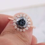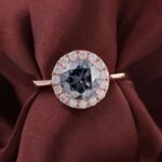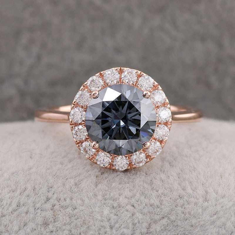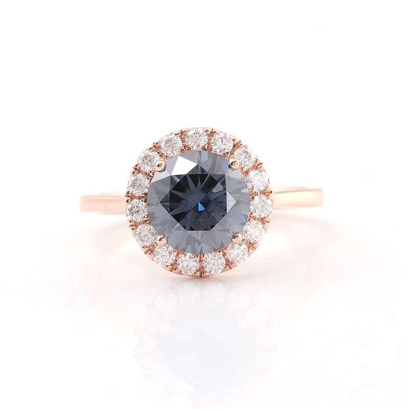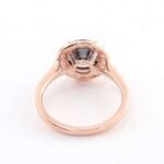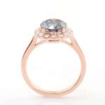 This Rose Gold Moissanite Ring showcases a round cut moissanite with VVS clarity, set in rose gold. The round cut main stone is surrounded by smaller moissanite stones, creating a halo effect that enhances its vintage charm. The rose gold gives the ring a warm and luxurious feel, making it a timeless piece of jewelry.