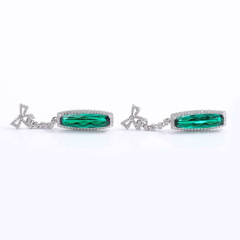 Enhance your elegance with our 18K White Gold Emerald and moissanite Bow Drop Earrings. These stunning earrings feature exquisite 18x5mm emeralds, beautifully complemented by a cascade of moissanite. The design is topped with a charming bow, adding a touch of sophistication and femininity. The earrings are meticulously crafted from high-quality 18K white gold, ensuring durability and brilliance. Perfect for special occasions or adding a luxurious touch to everyday wear, these earrings are a timeless symbol of grace and beauty.